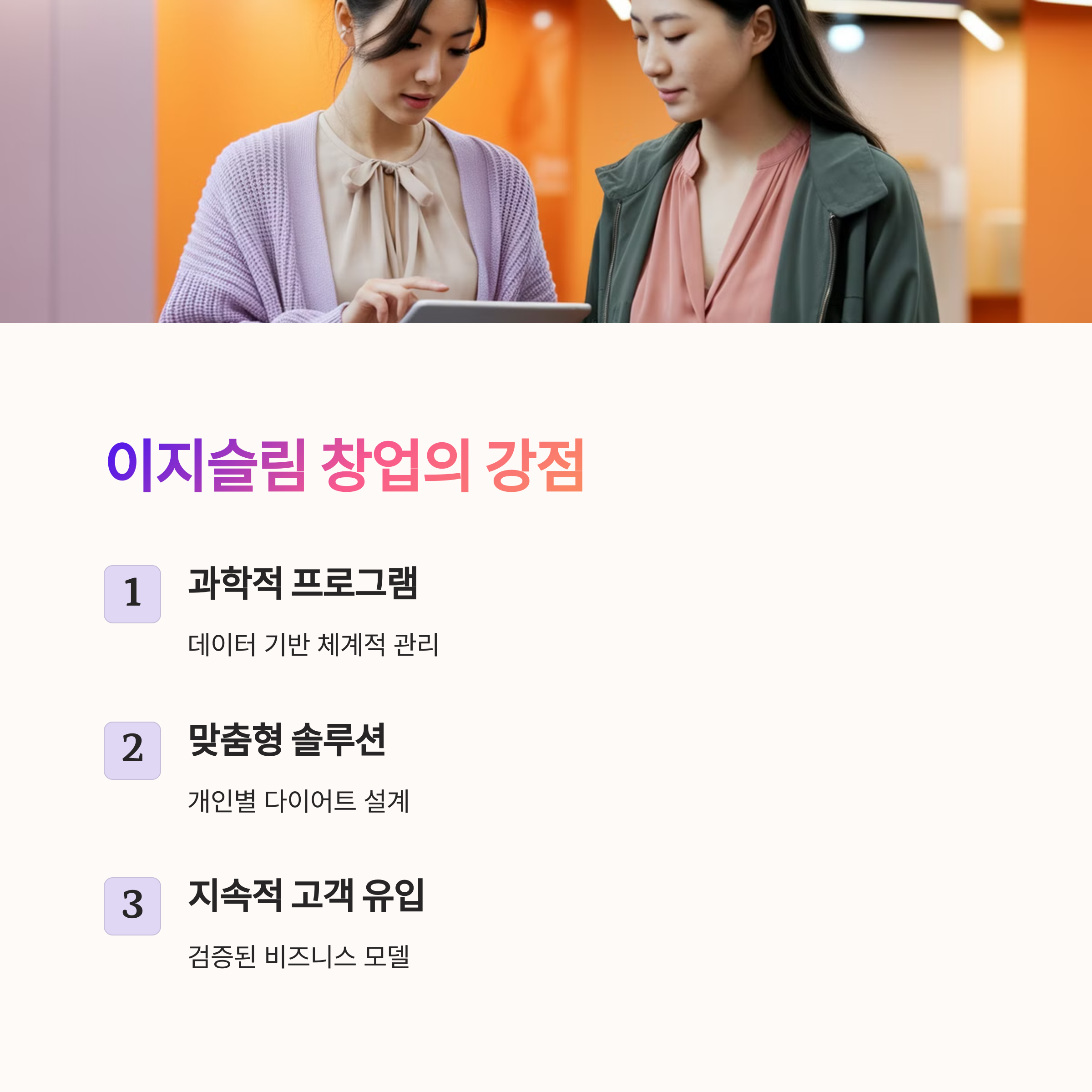 이지슬림다이어트는 안정적인 창업과 지속적인 성공을 위한 체계적인 지원 시스템을 제공합니다. 광교역의 유망한 상권에서 검증된 다이어트 비즈니스 모델을 기반으로 창업하여, 건강과 아름다움을 추구하는 고객들에게 새로운 가치를 제공하세요!