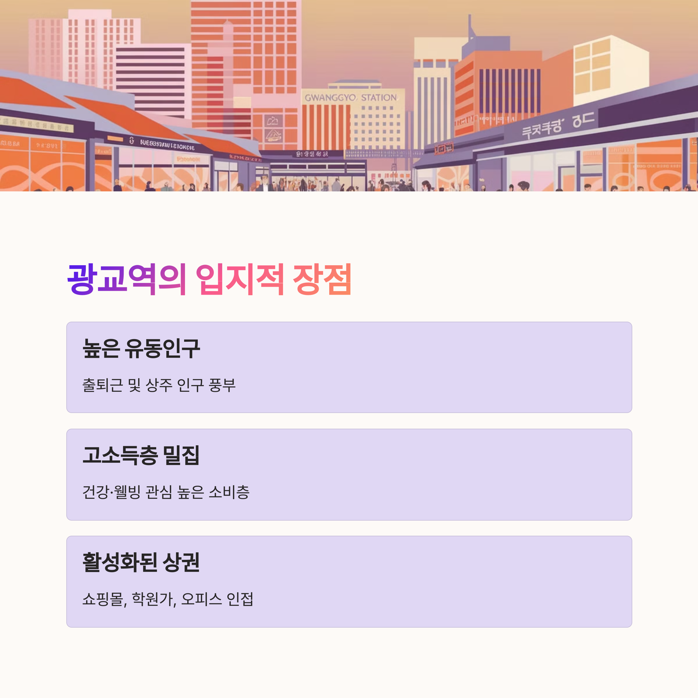 광교역은 수원 및 경기 남부권에서 가장 빠르게 성장하는 지역 중 하나입니다. 유동인구가 많고, 직장인 및 젊은 층의 유입이 활발하여 다이어트와 건강 관리에 대한 수요가 높은 지역입니다.
