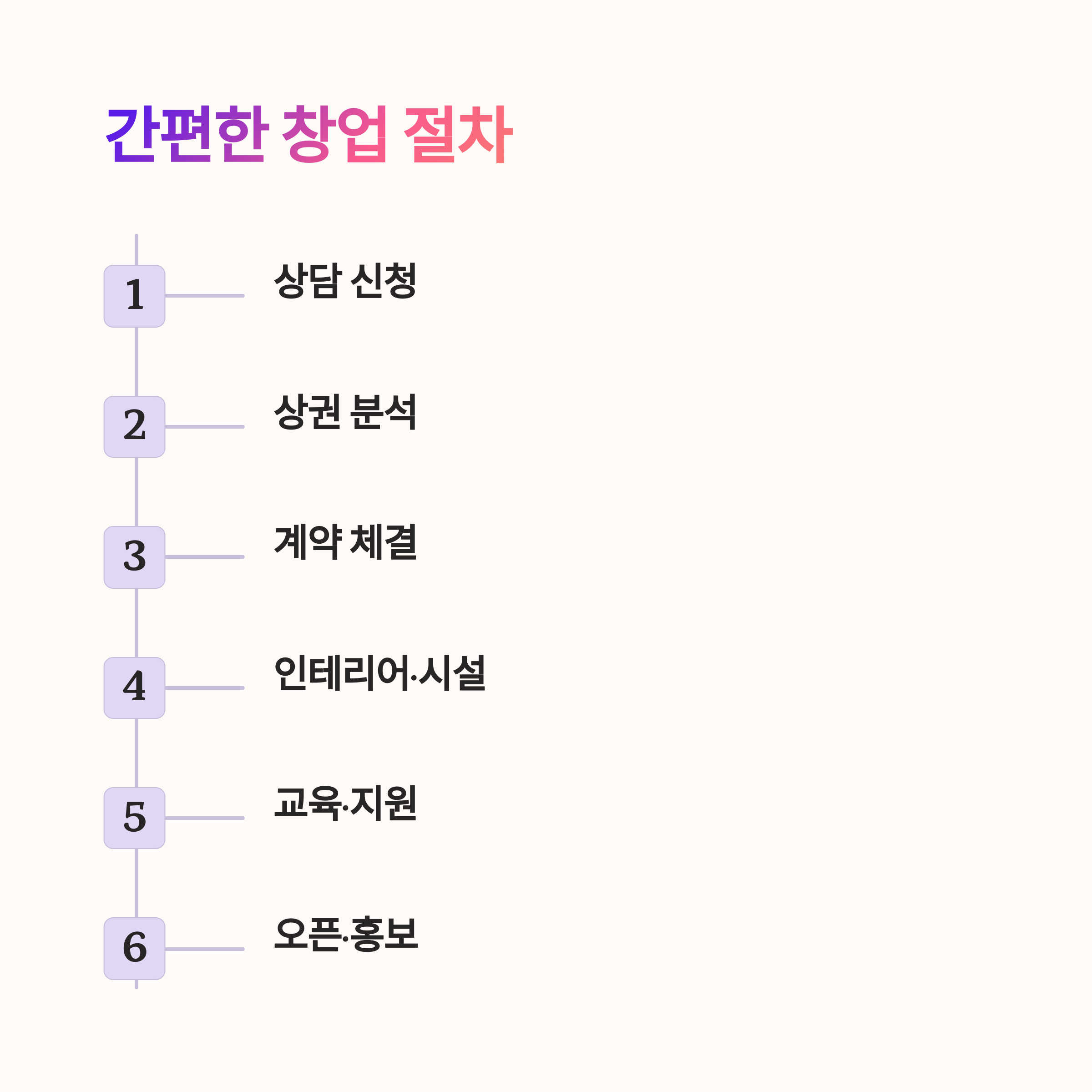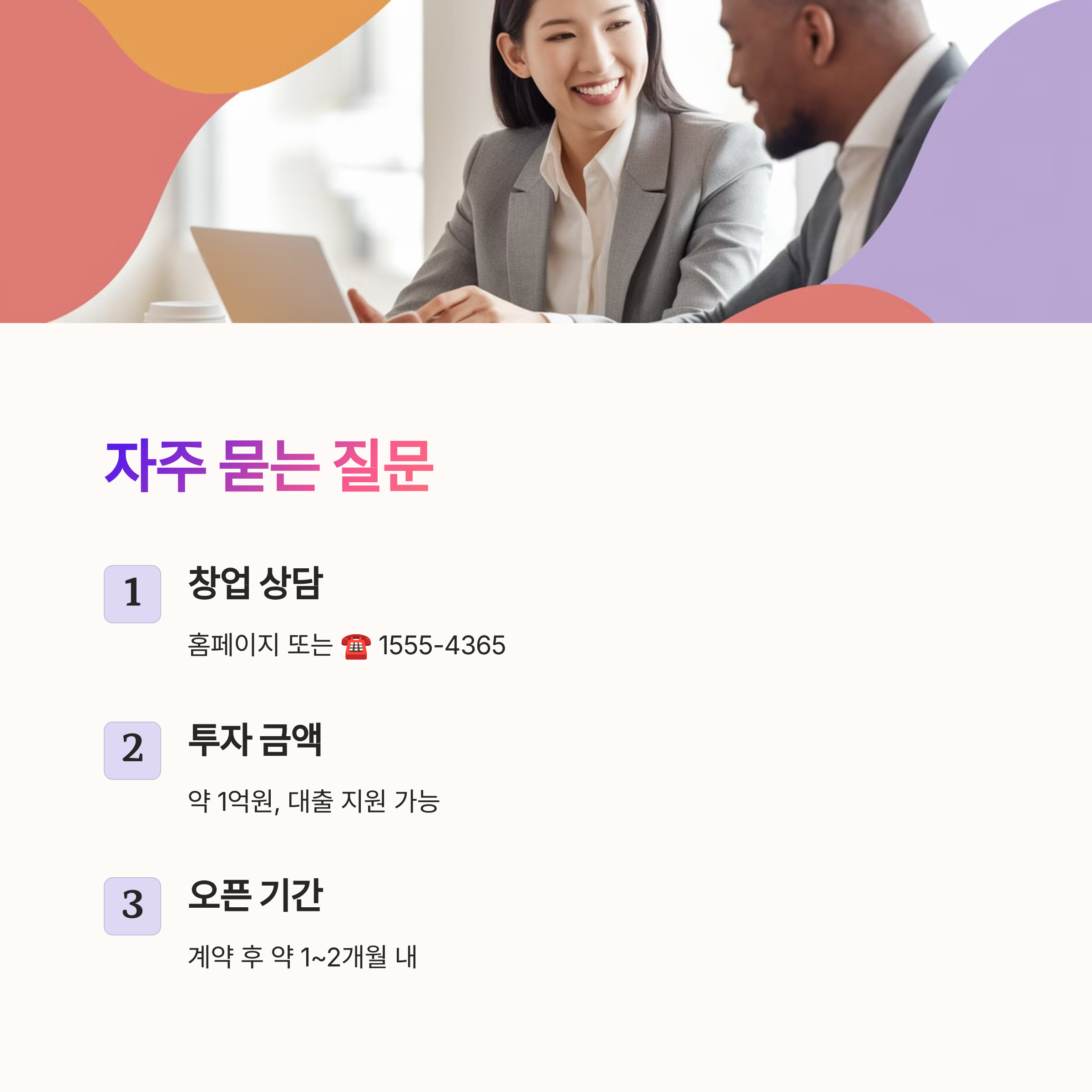 계약 후 약 1~2개월 내에 오픈이 가능합니다. 점포 준비와 교육 기간에 따라 다를 수 있습니다.