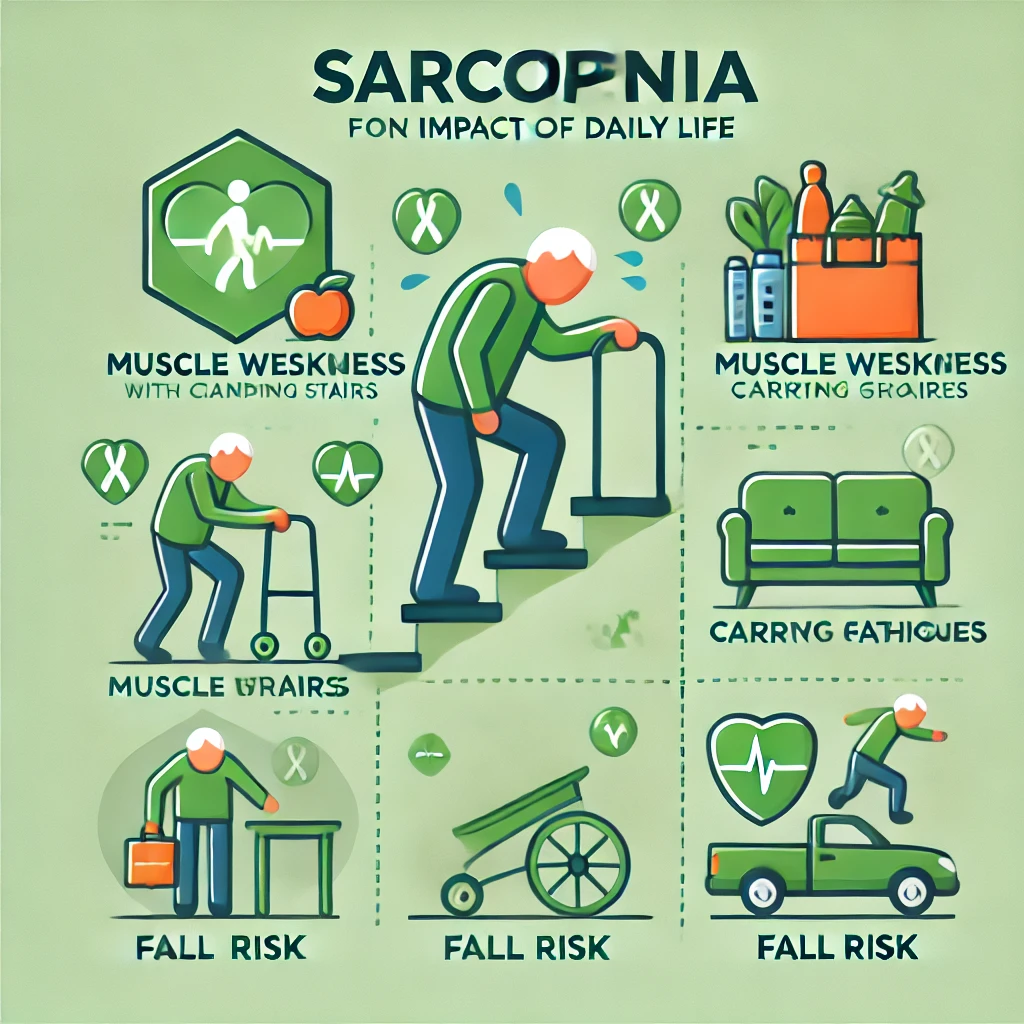 | 근감소증이 진행되면 균형 감각이 약해져 낙상 위험이 증가하고, 신체 기능 저하로 인해 독립적인 생활이 어려워질 수 있습니다. 또한 면역력 약화와 만성 질환 위험 증가로 건강에 심각한 영향을 미칠 수 있으므로 조기 예방이 중요합니다! |