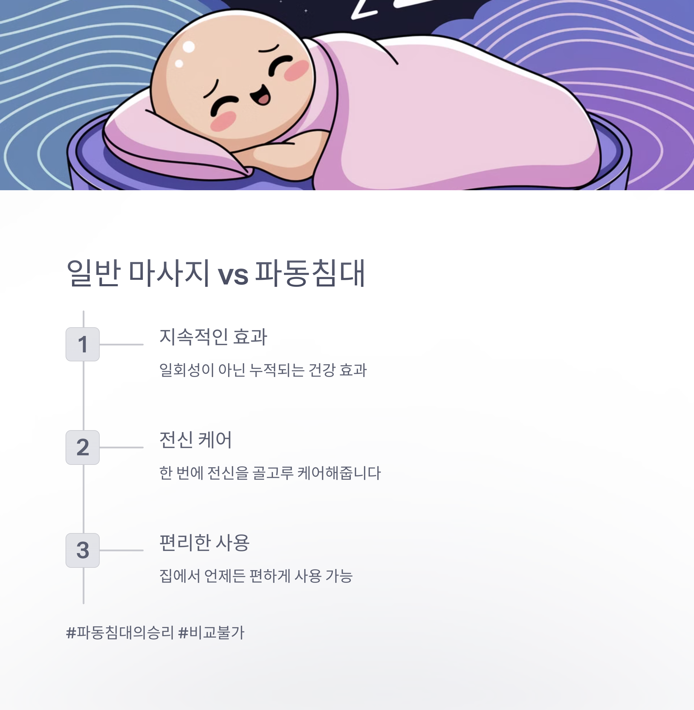 • 일반 마사지는 강한 압력으로 근육을 누르지만, 파동침대는 부드러운 진동으로 근육을 풀어줍니다.