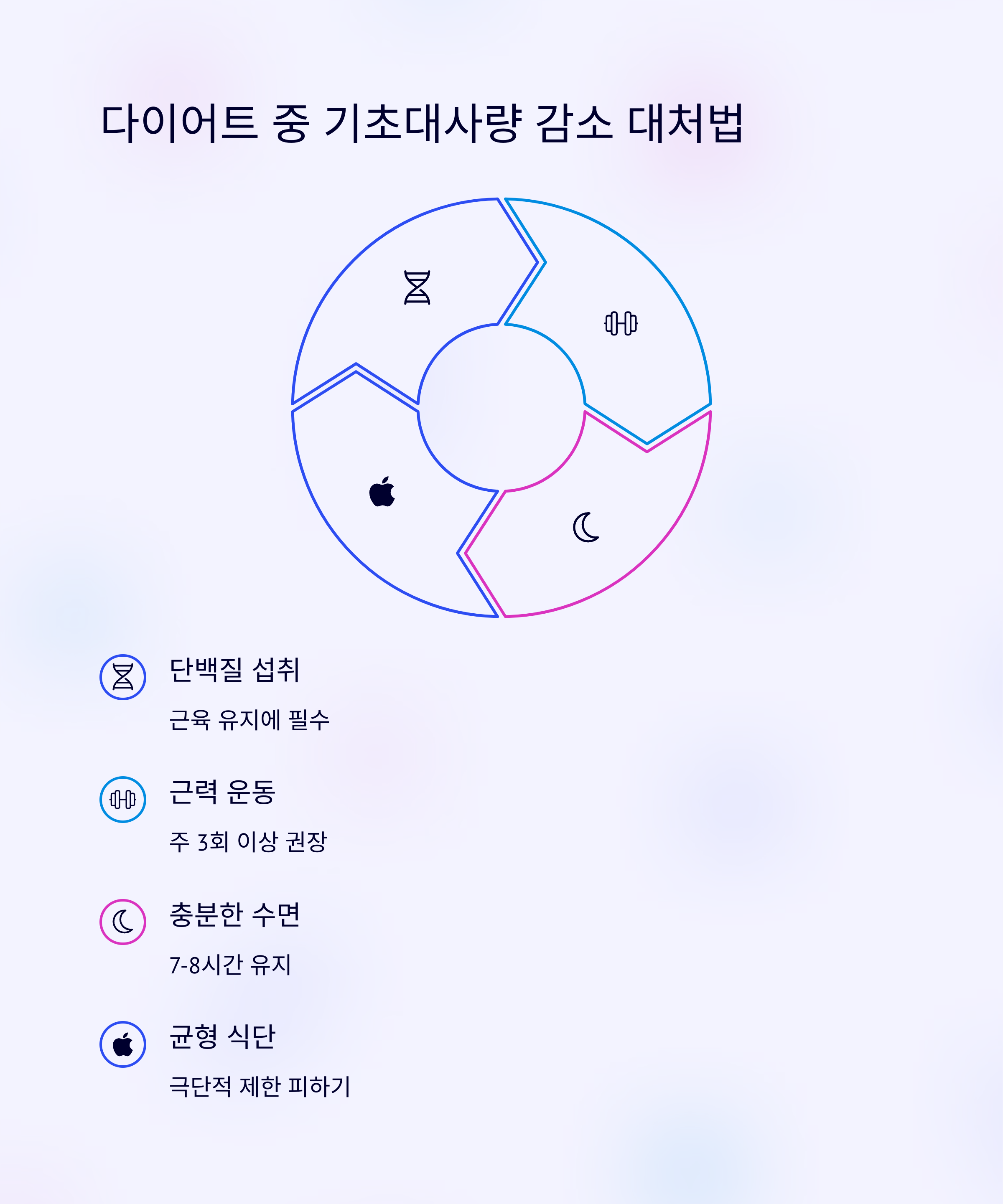 무리한 식이 제한은 대사량을 떨어뜨릴 수 있어요. 단백질 섭취와 근력운동, 충분한 수면으로 다시 끌어올려보세요.