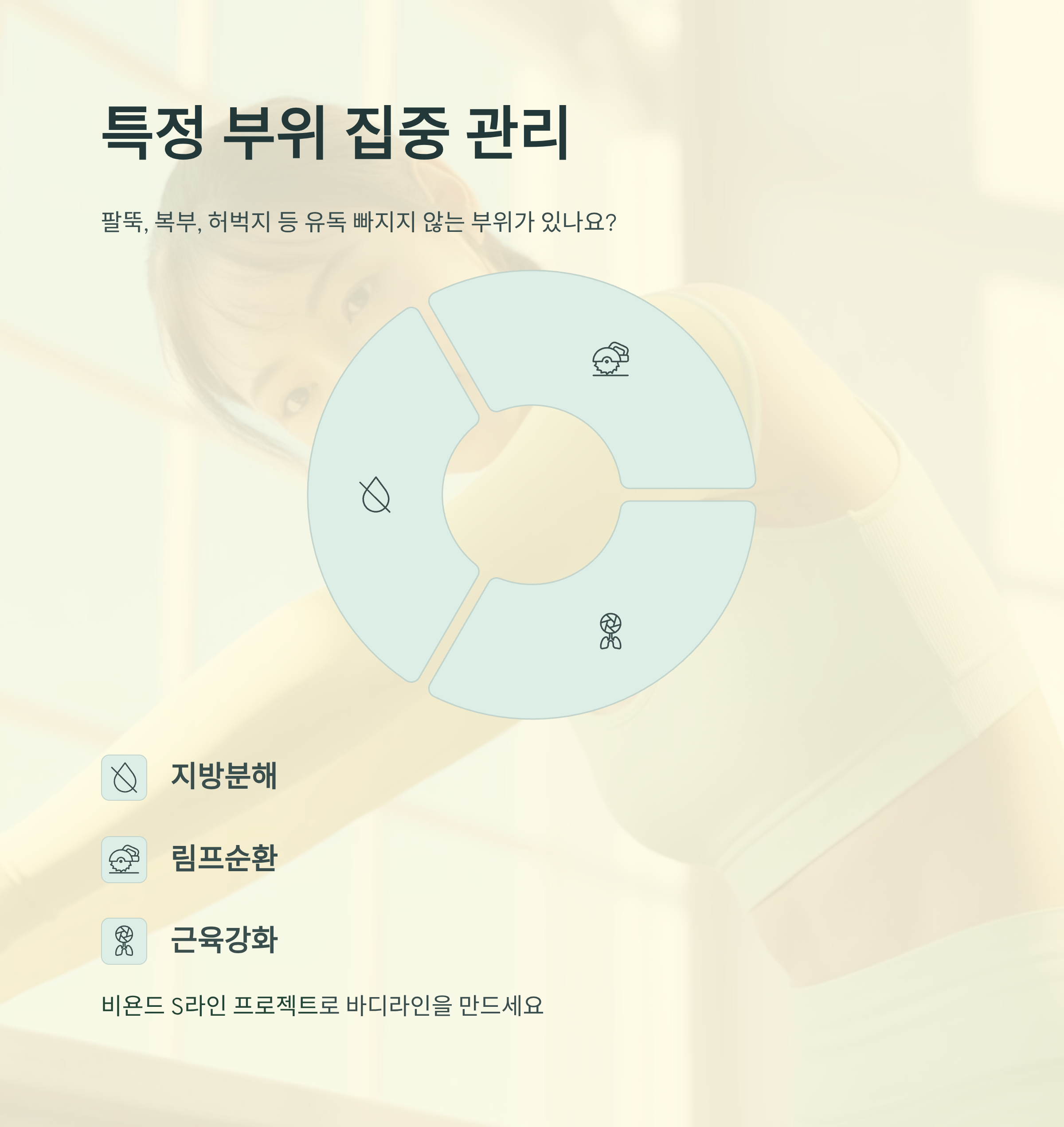 ‘비욘드 S라인 프로젝트’는 특정부위 집중 관리 프로그램으로 지방분해 + 림프순환 + 근육강화를 함께 제공합니다.