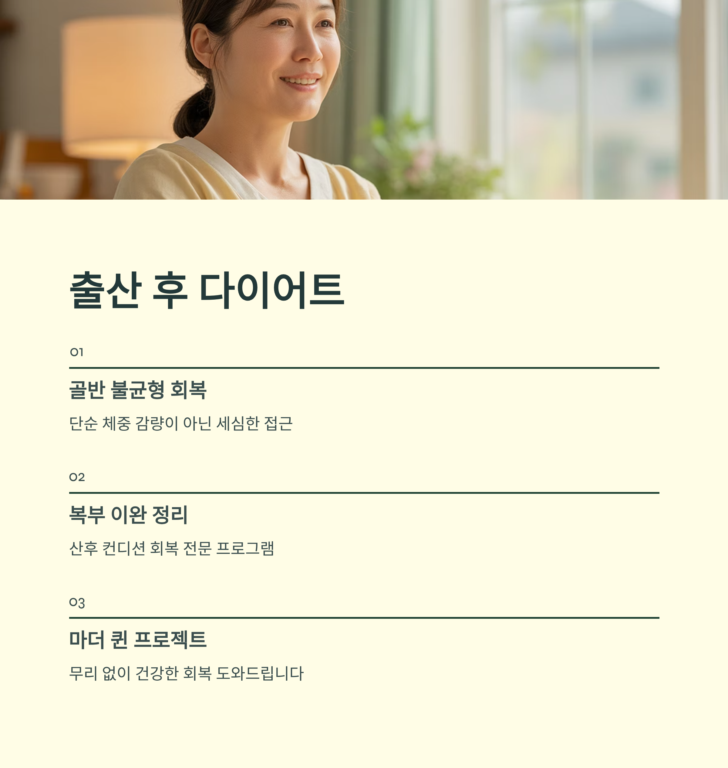 ‘마더 퀸 프로젝트’는 산후 컨디션 회복과 바디라인 정리를 위한 전문 산후 다이어트 프로그램입니다.