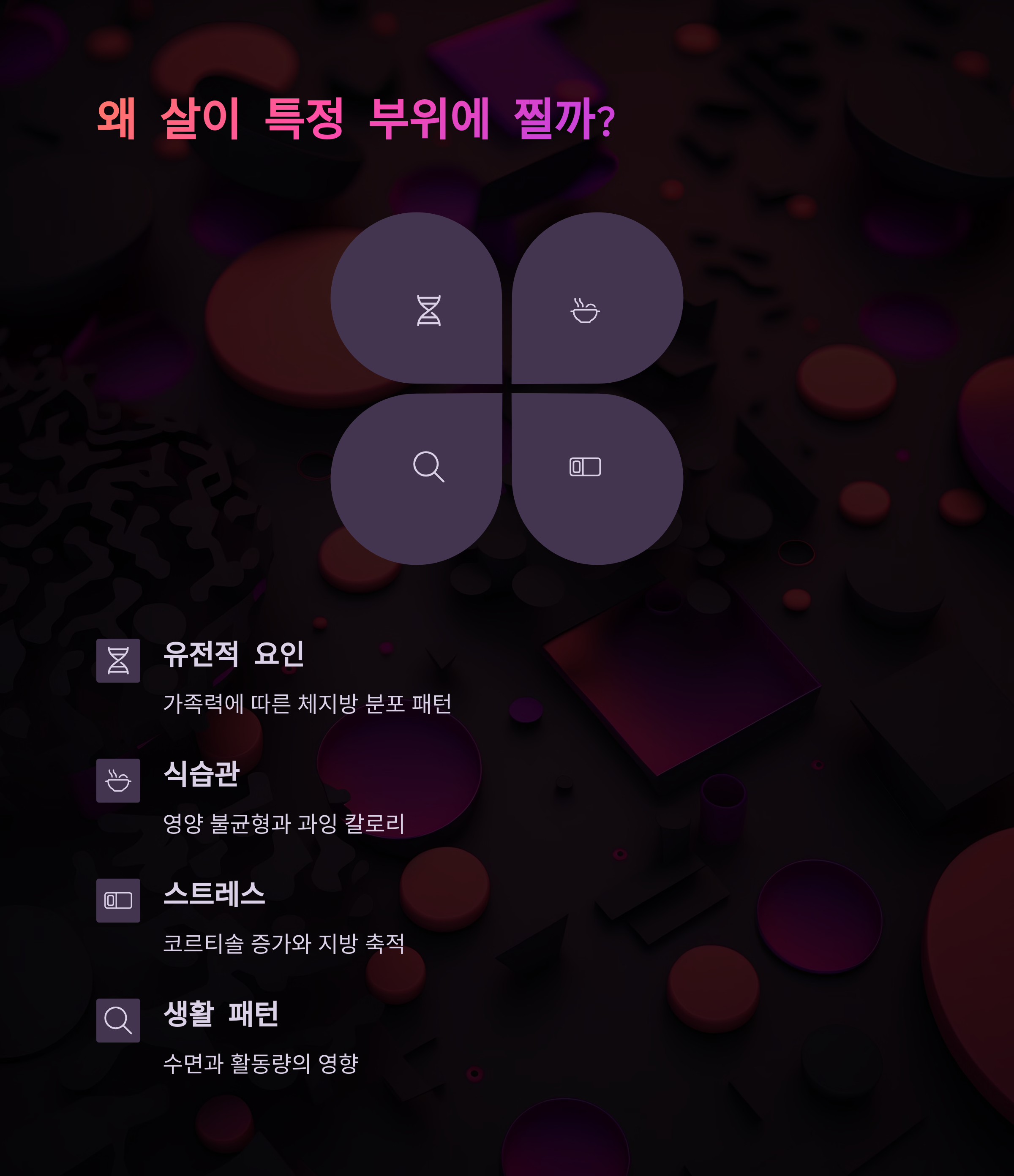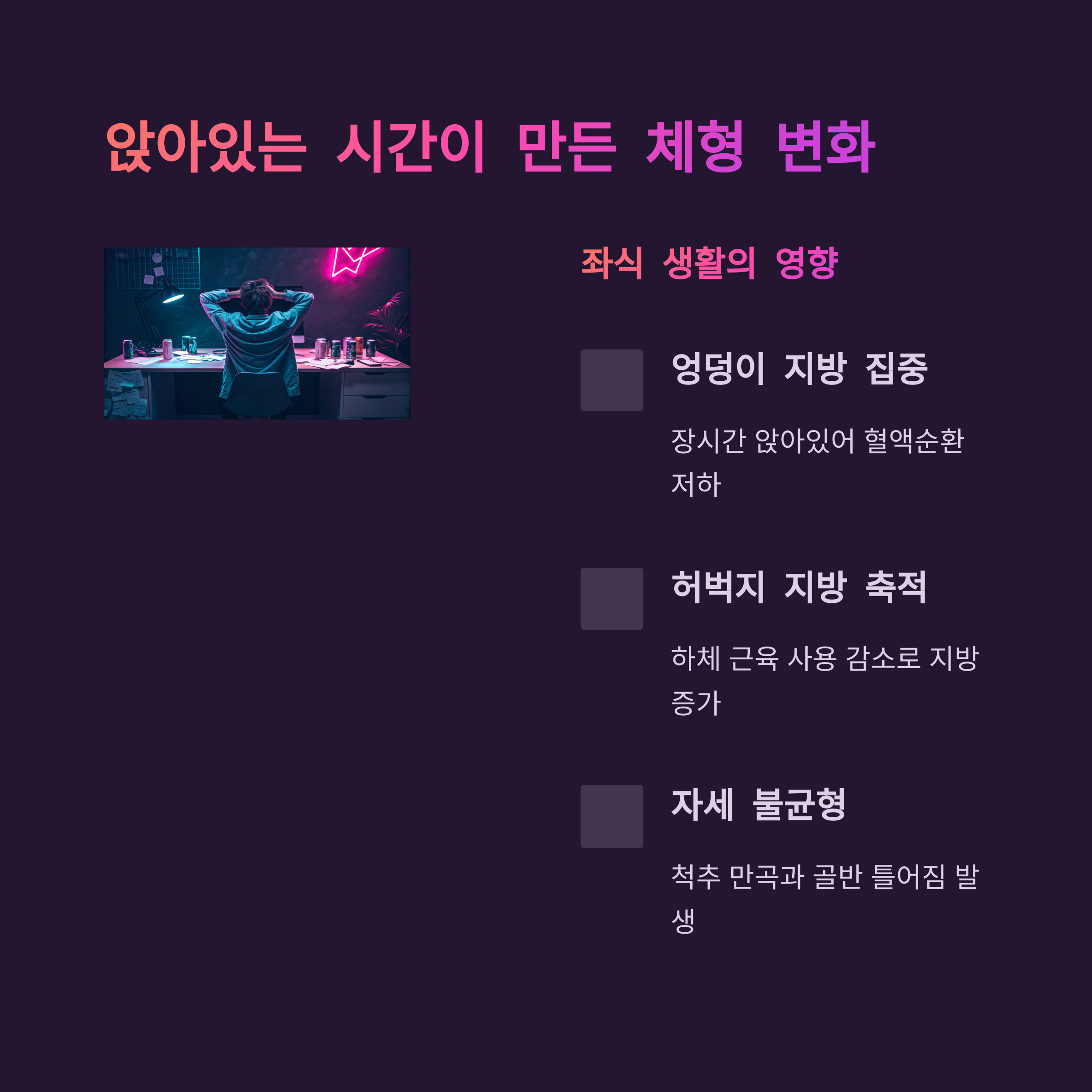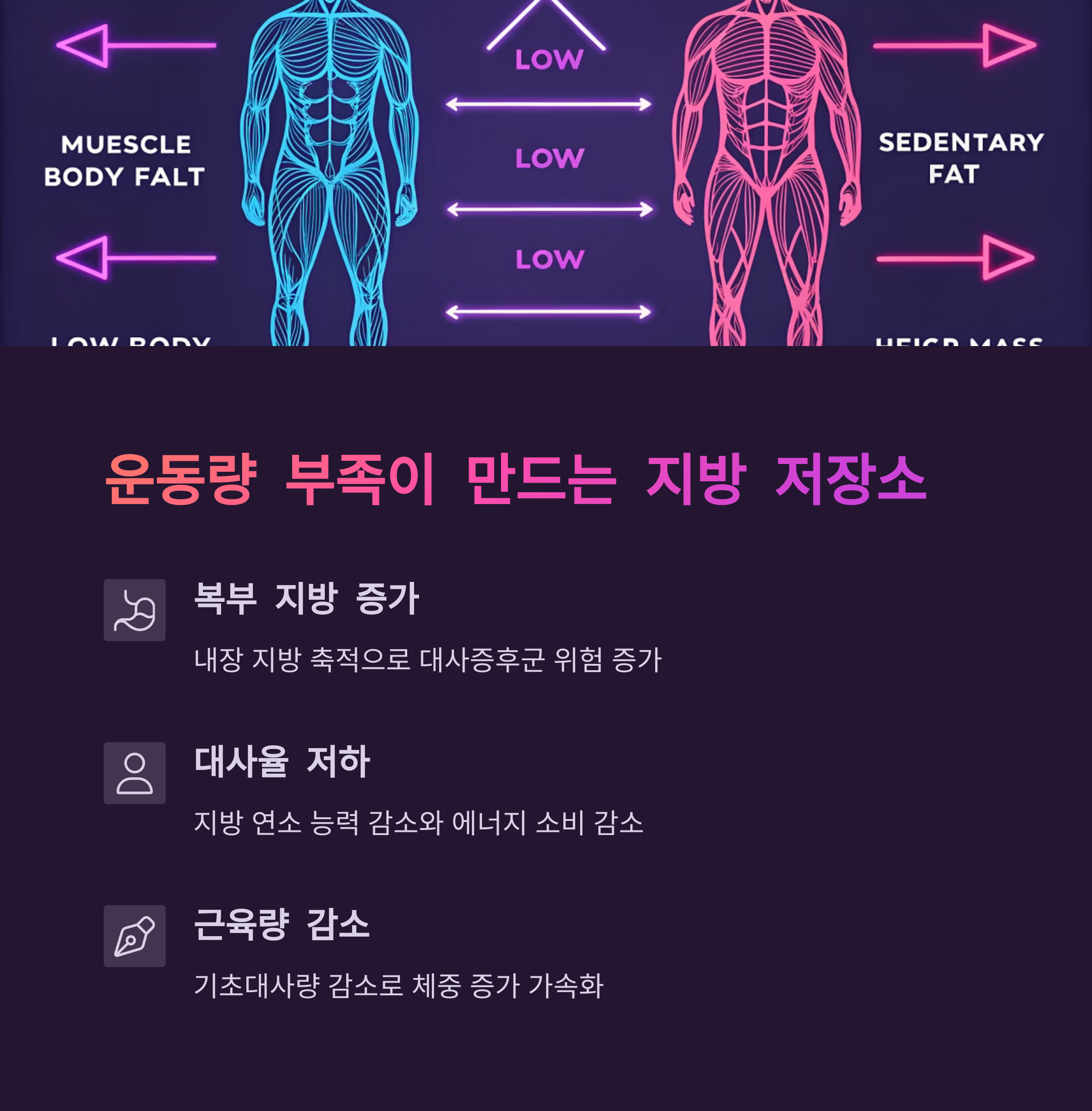 즉, 운동량 부족은 특정 부위에 지방을 쌓이게 만드는 핵심 요인입니다.