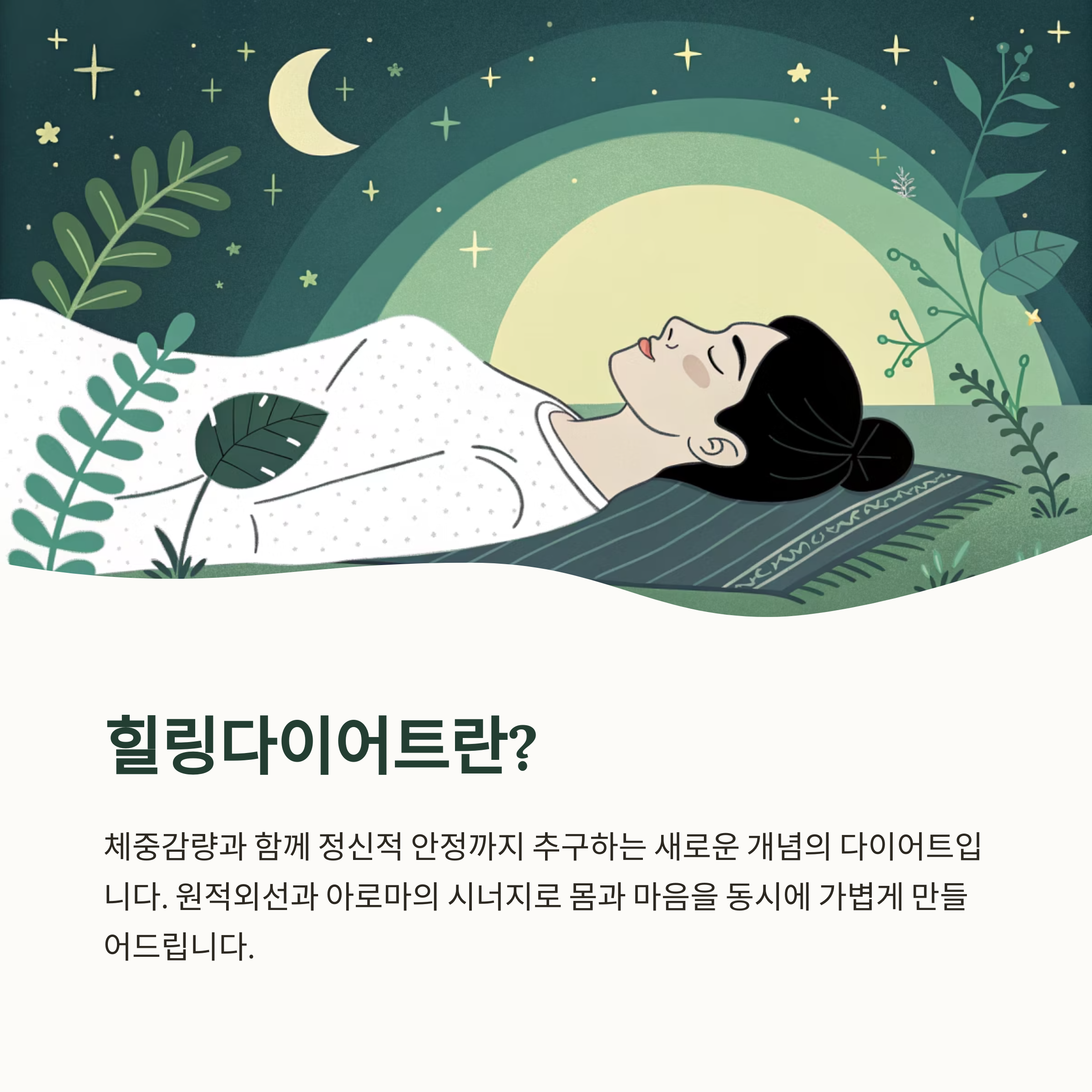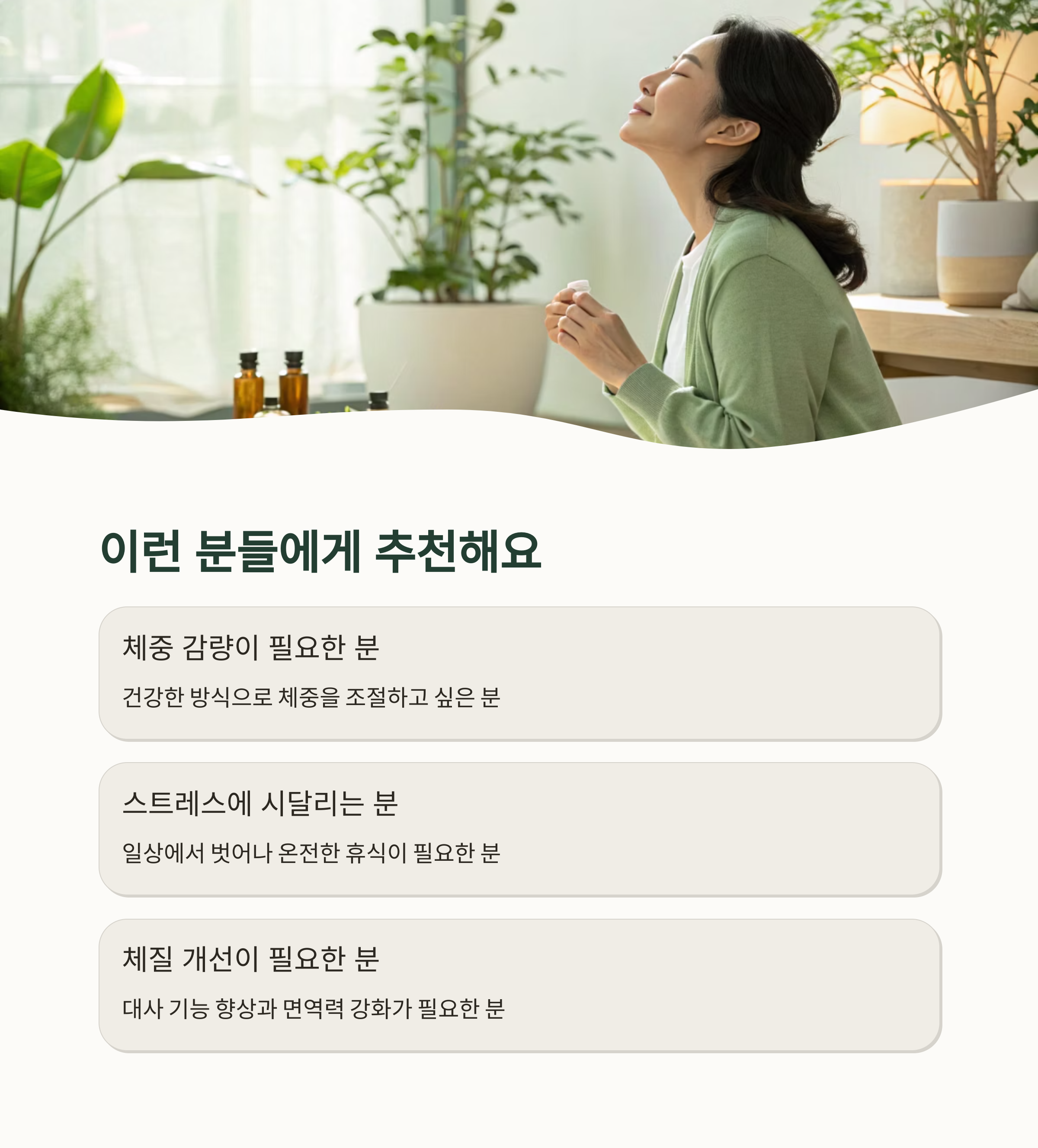 다이어트는 힘들고 괴로운 것이라는 고정관념을 벗어나, 누워서 쉬면서도 회복되는 시간을 통해 내면의 에너지를 다시 채우는 방식이죠.