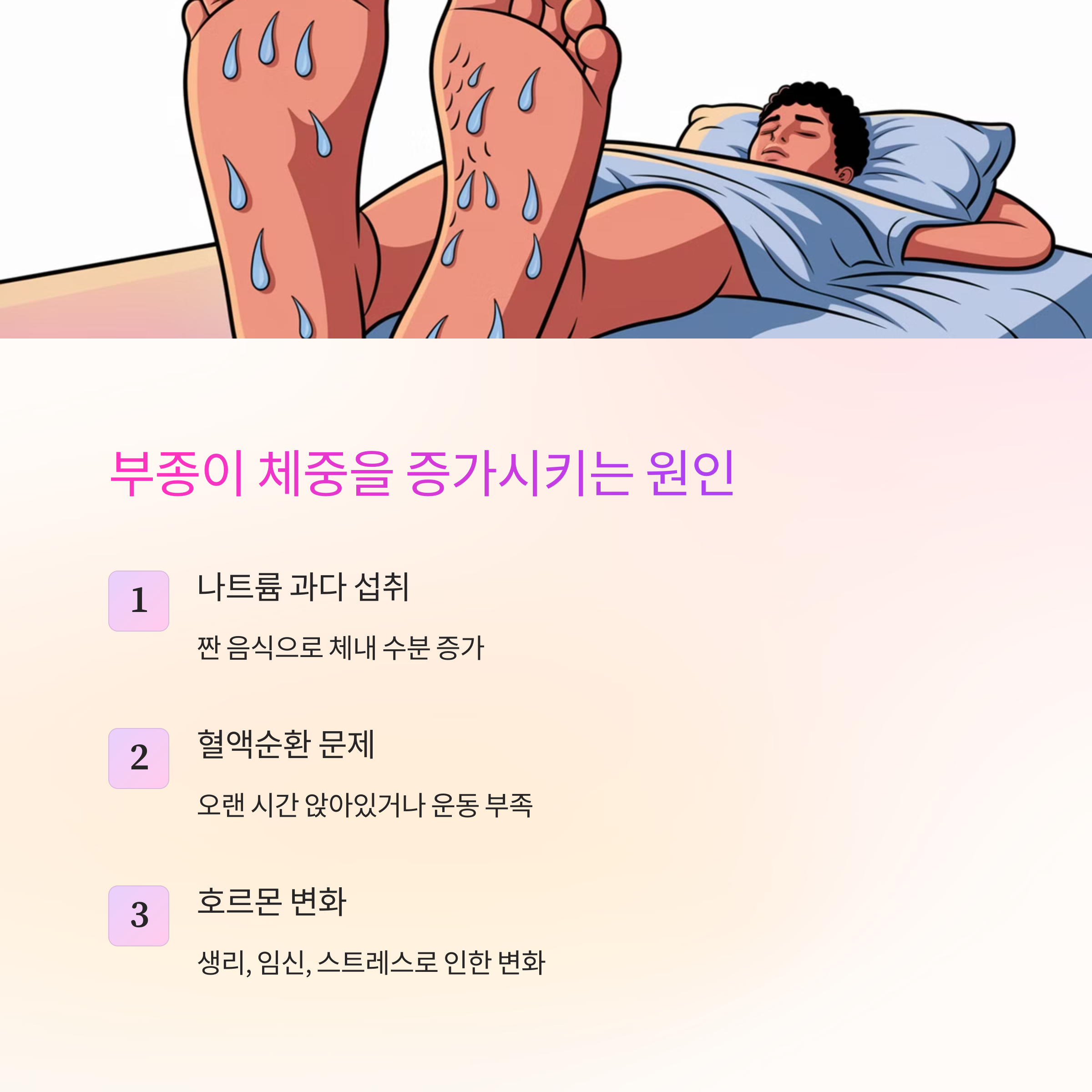 부종은 체내에 불필요한 수분이 쌓이는 현상으로, 갑자기 몸이 무거워지고 부어 보이게 만듭니다. 많은 사람들이 체중 증가를 지방 때문이라고 생각하지만, 사실 부종만으로도 몇 킬로그램이 증가할 수 있습니다. 부종이 발생하는 주요 원인은 다음과 같습니다.