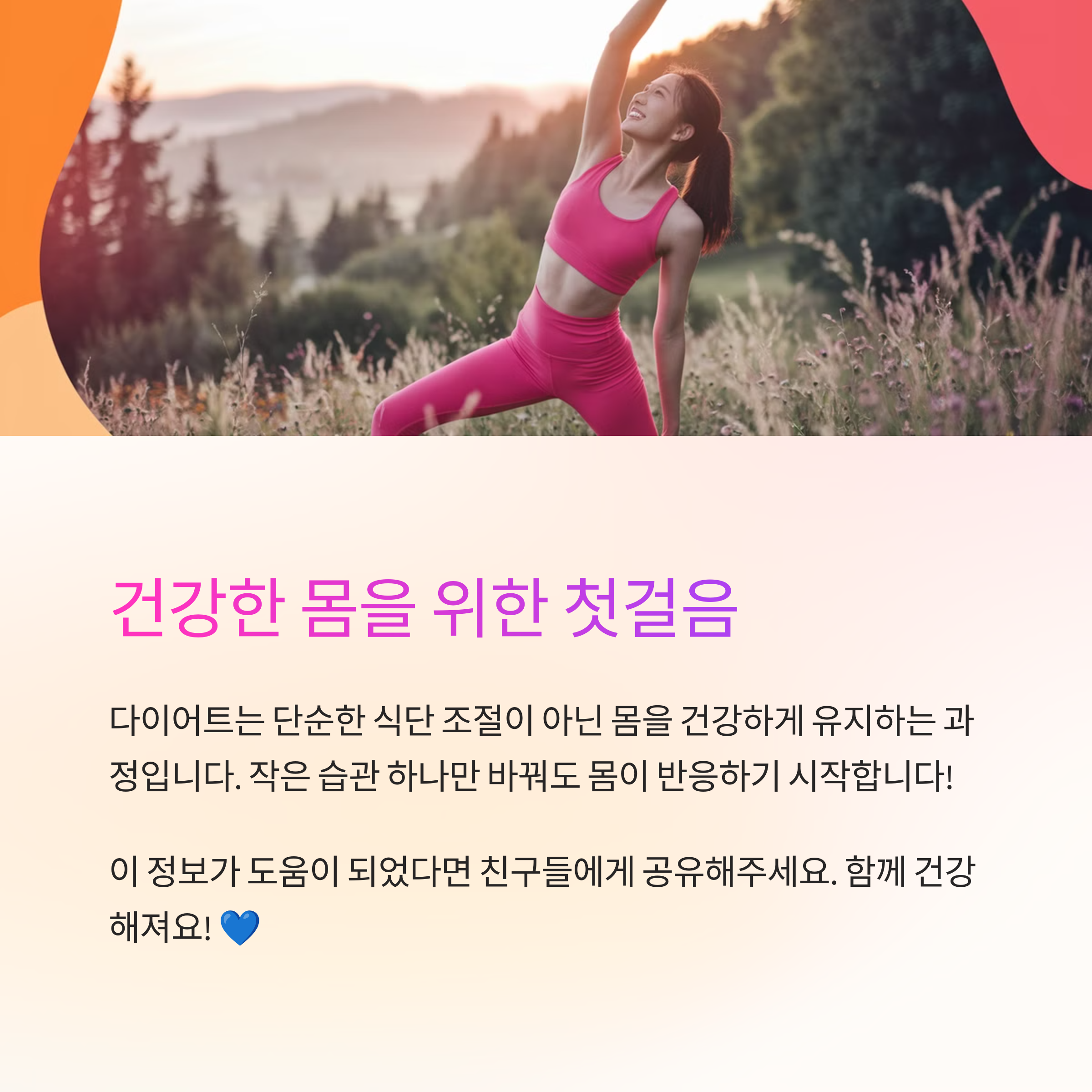 오늘 배운 내용을 바탕으로 나에게 맞는 다이어트 방법을 찾아보세요. 작은 습관 하나만 바꿔도 몸이 반응하기 시작합니다!