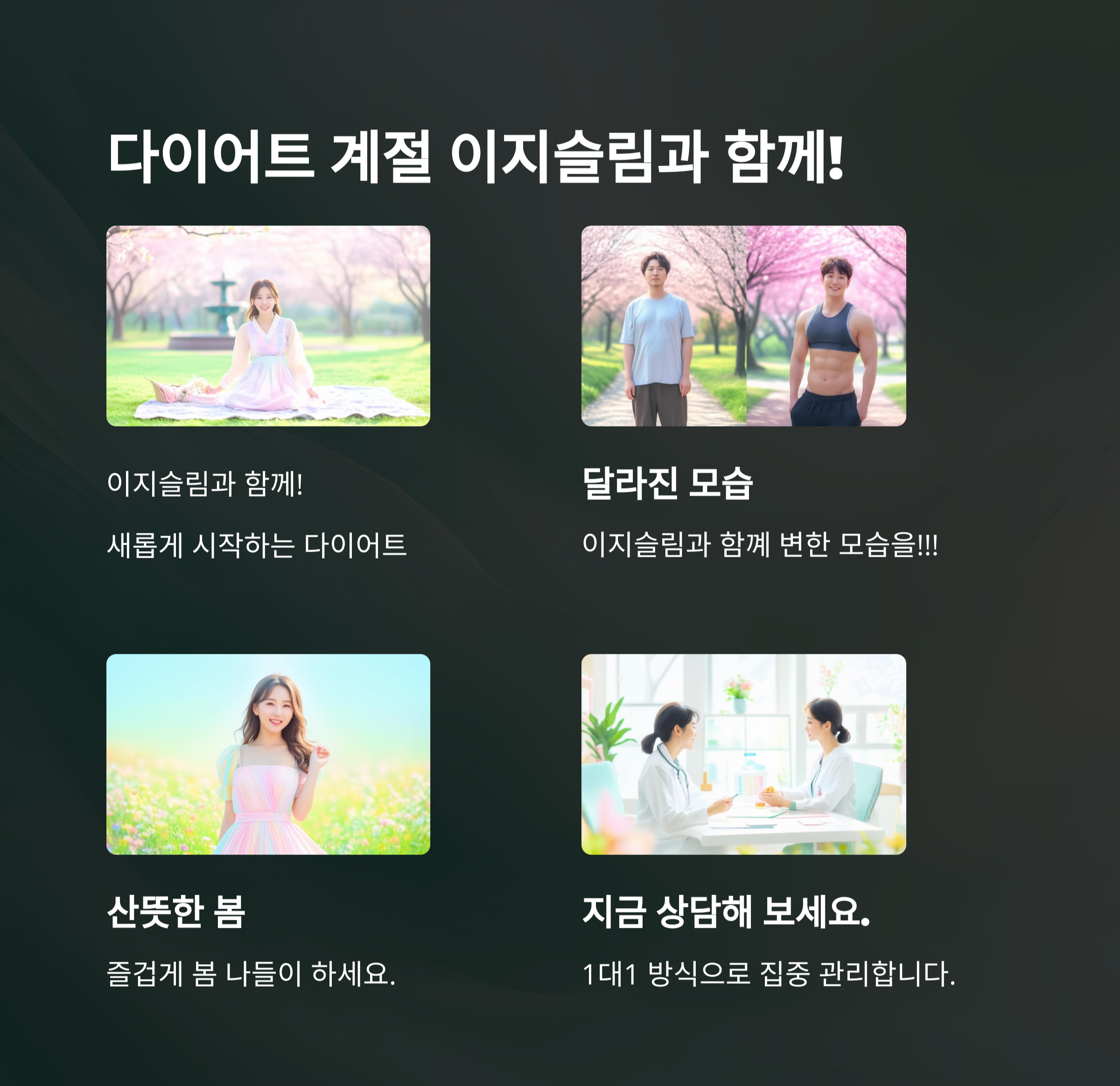 다이어트는 단기간의 프로젝트가 아니라 건강한 습관을 만들어가는 과정입니다. 봄철은 자연스럽게 신체 활동이 늘어나고 신진대사가 촉진되기 때문에 체중 감량을 시작하기에 가장 적절한 시기입니다. 운동과 식단 조절을 병행하면 보다 균형 잡힌 몸과 생활을 유지할 수 있습니다. 작은 변화들이 쌓여서 큰 변화를 만들어냅니다. 지금 바로 건강한 다이어트를 시작해 보세요.