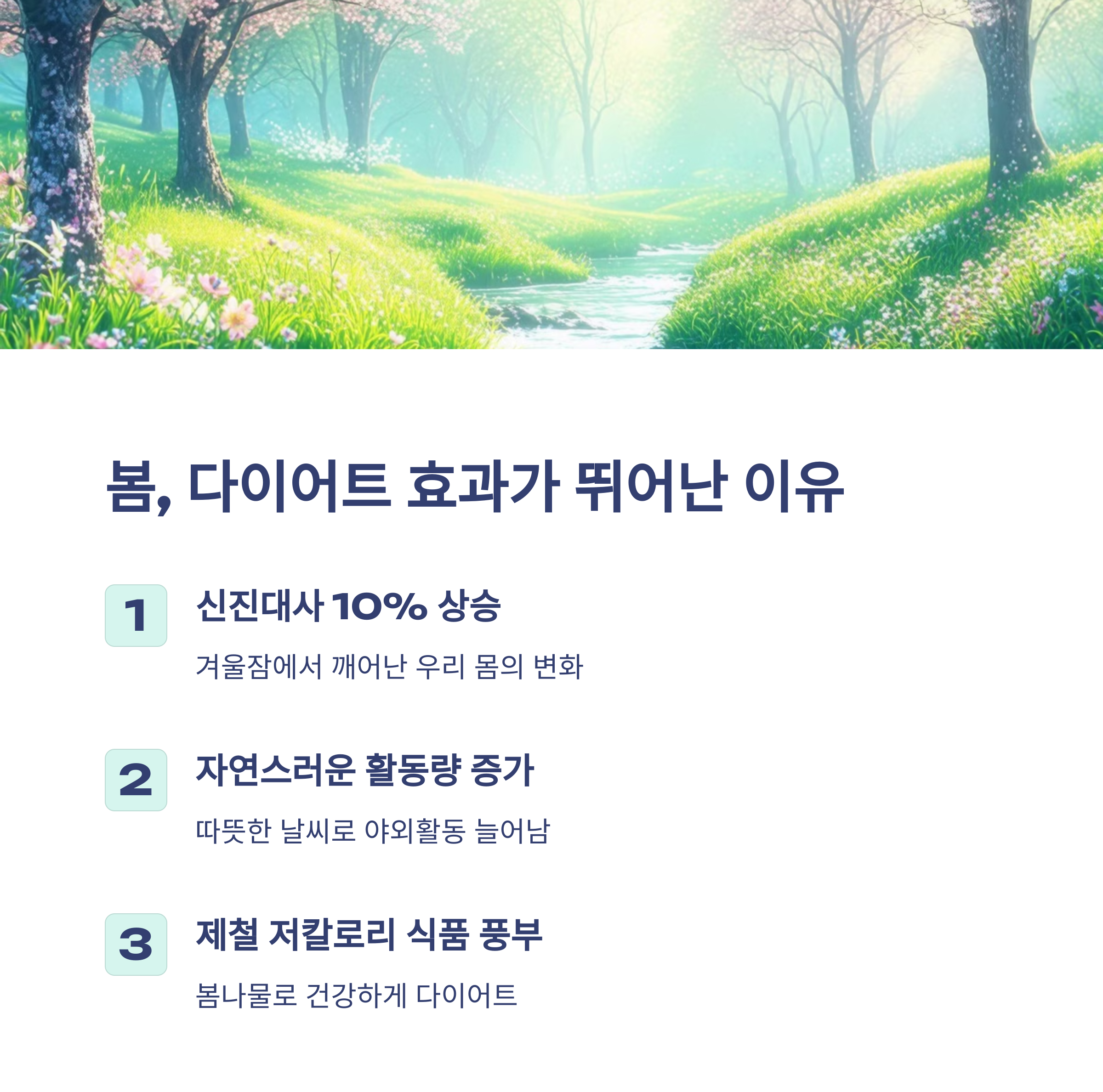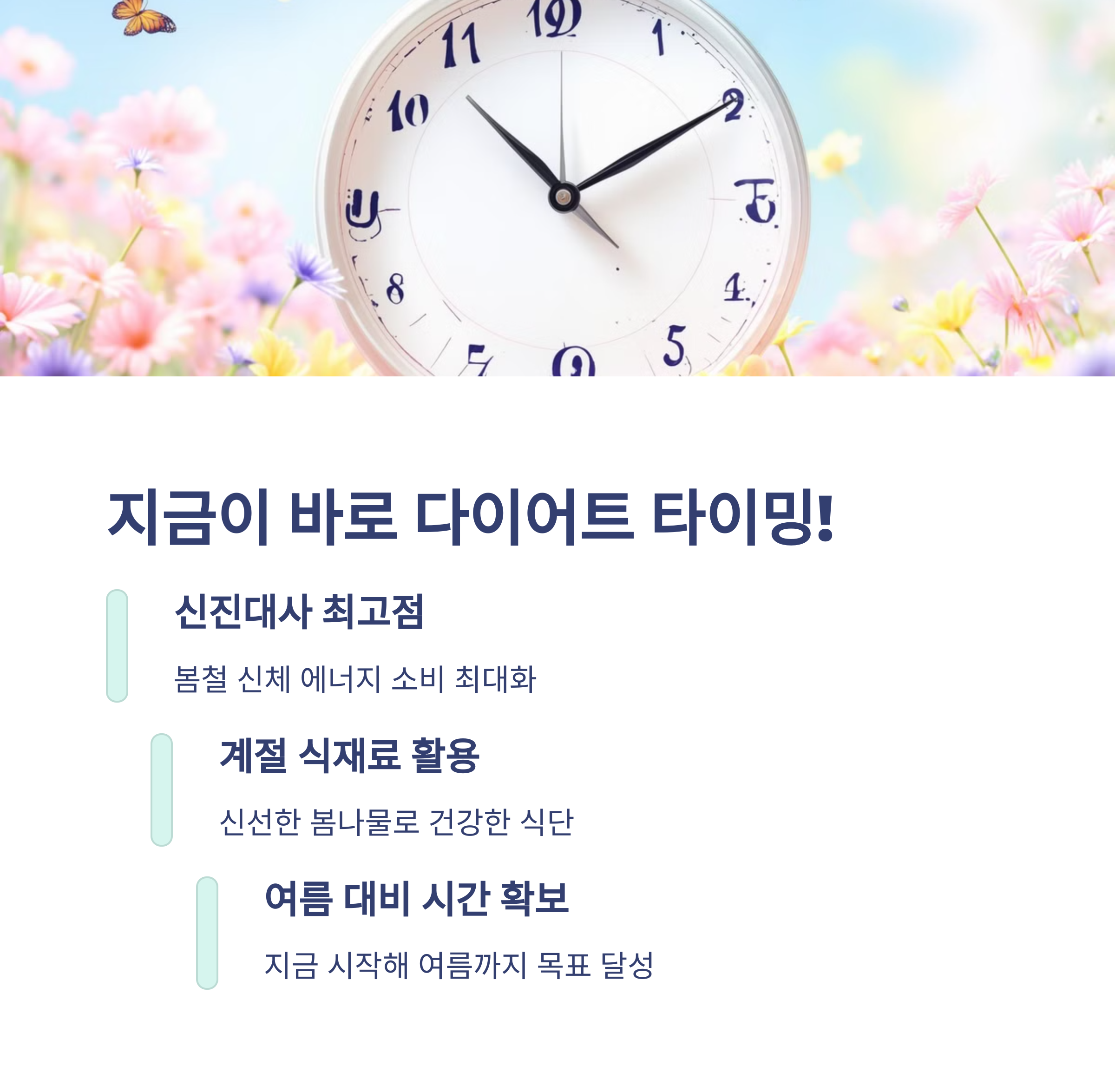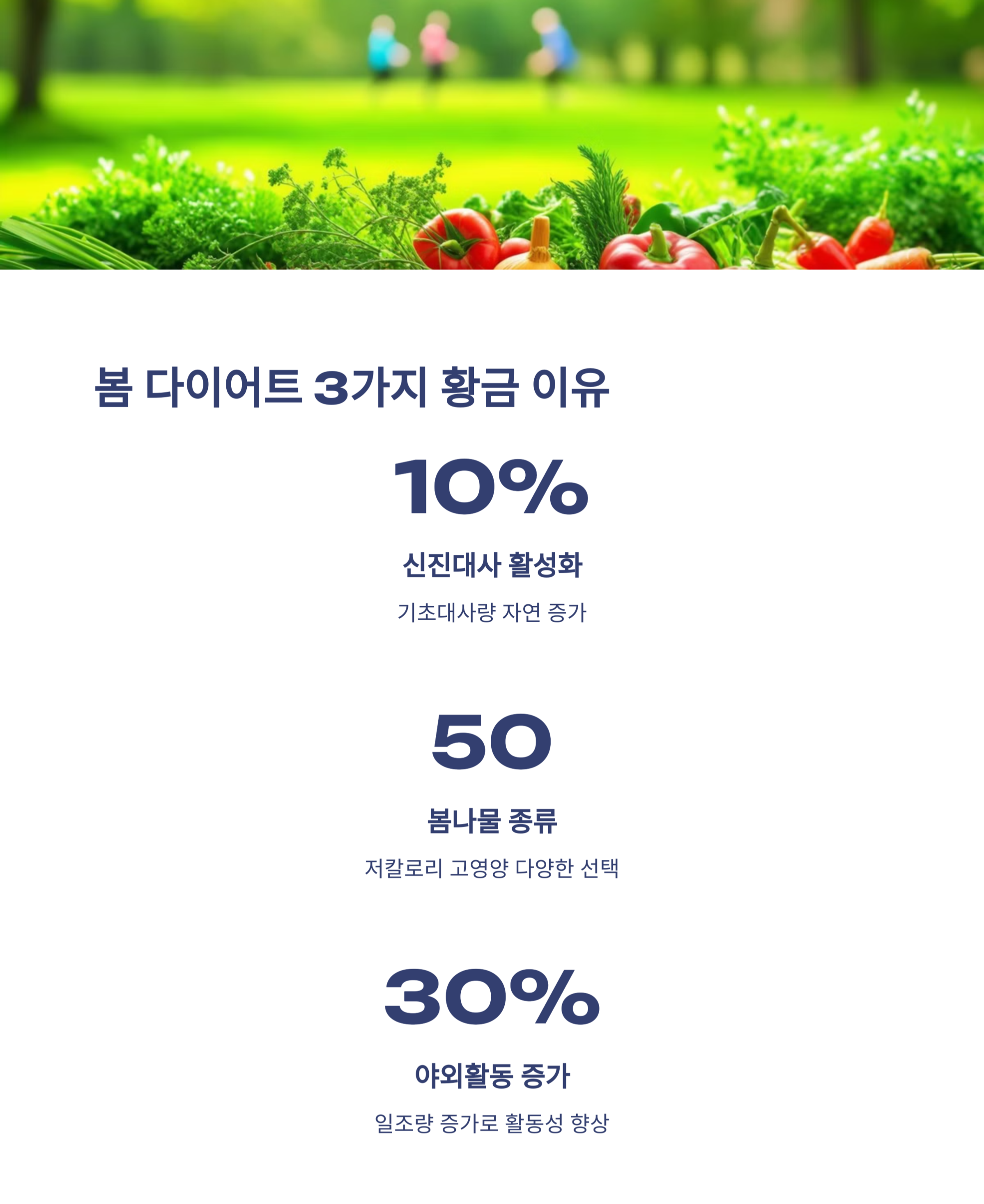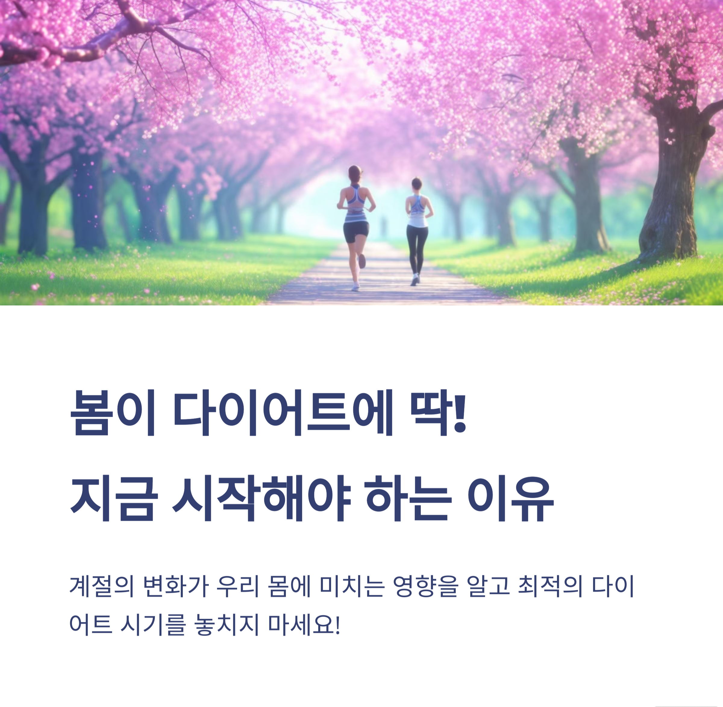 봄은 우리 몸의 신진대사가 가장 활발해지는 계절로, 조금만 노력해도 체중 감량 효과가 높아지는 골든타임입니다.