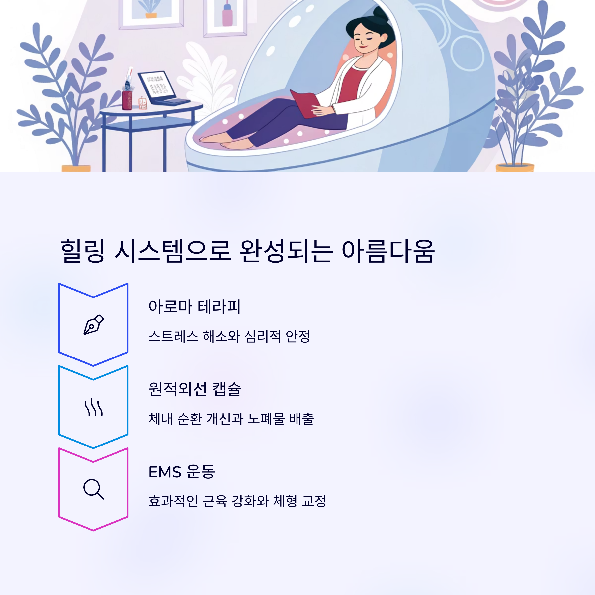 천연 아로마오일과 원적외선 체온관리, 그리고 누워서도 가능한 EMS 운동을 결합한 힐링 시스템은 몸뿐 아니라 마음까지 어루만져주는 편안함을 제공합니다.