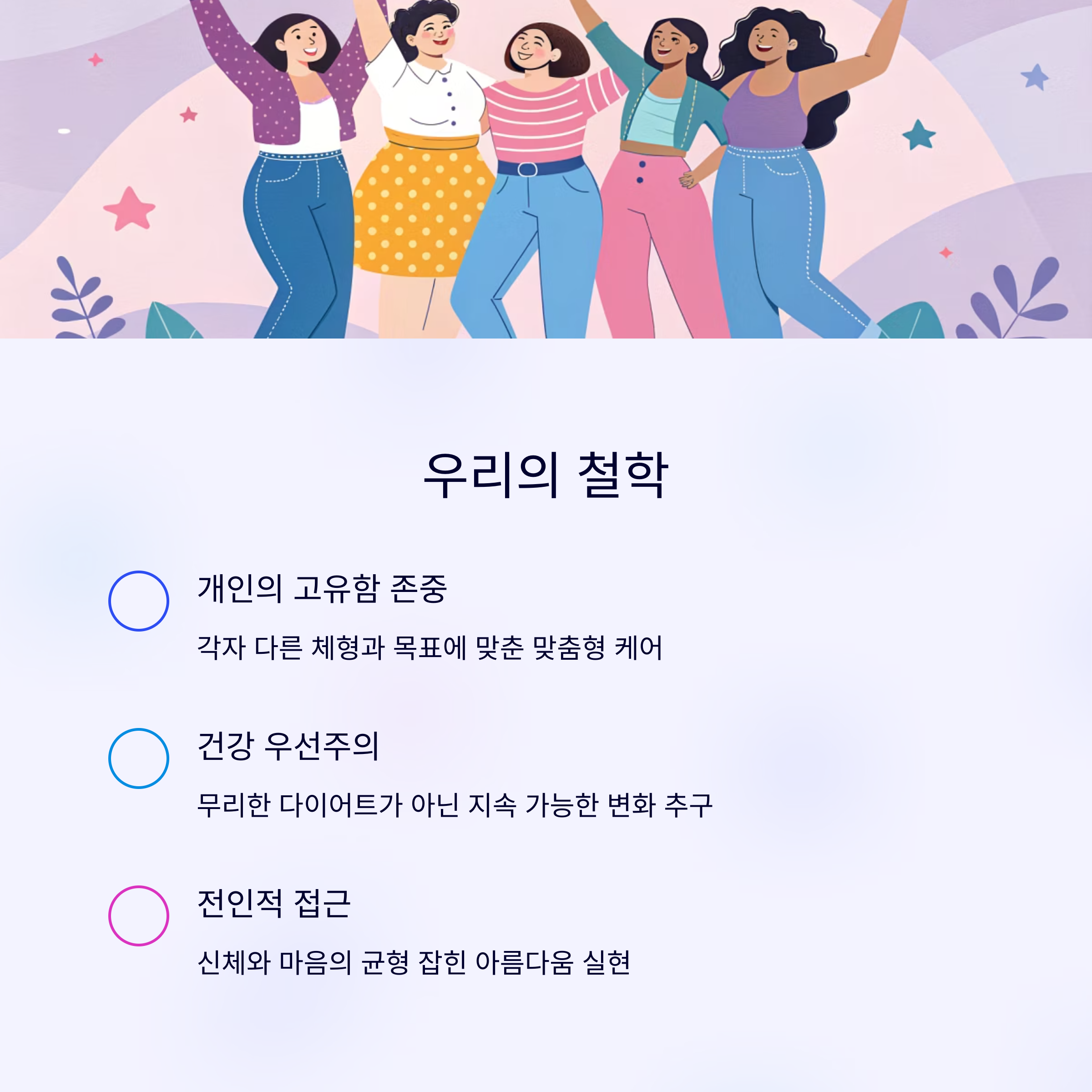 | 개인 존중 | 각자의 라이프스타일과 몸 상태를 고려한 맞춤형 케어 |