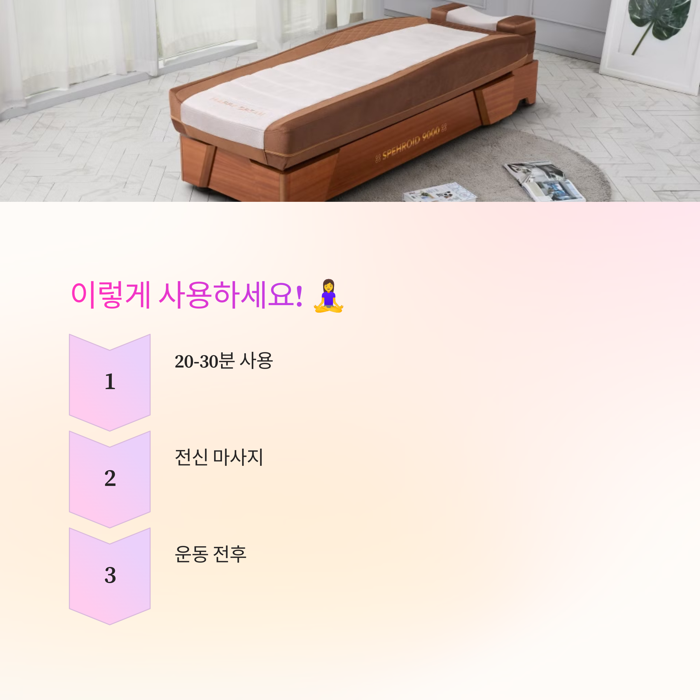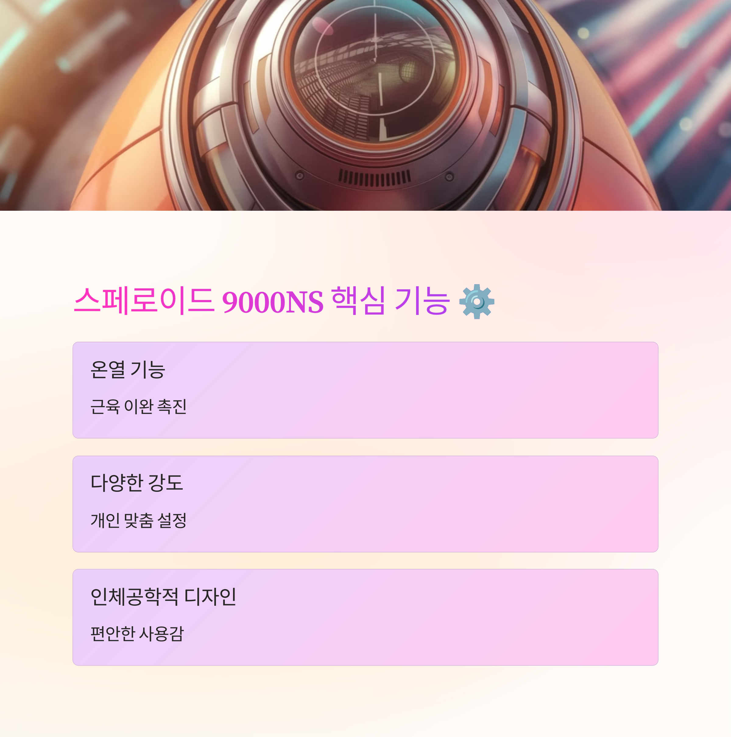 - 🤔 안마의자와 비교하면 어떤 점이 다른가요? - 안마의자는 압박 마사지 방식이지만, 스페로이드 9000NS는 진동을 활용하여 신체 깊숙이 자극을 줍니다.