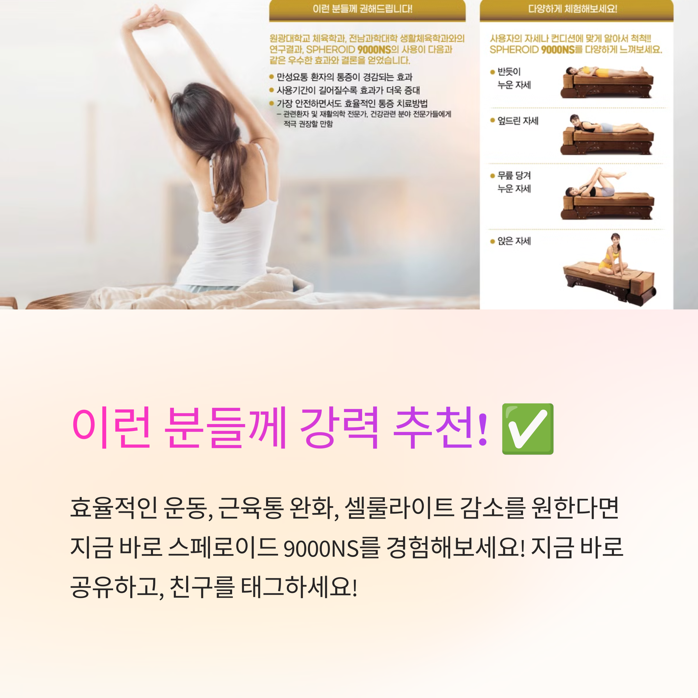 건강한 몸을 유지하고 싶다면, 스페로이드 9000NS를 활용해 보세요! 일상 속에서 간편하게 사용할 수 있어 꾸준히만 사용하면 확실한 효과를 경험하실 수 있습니다. 이제 더 이상 운동을 힘들게 할 필요 없이, 편안한 자세로 건강을 관리하세요!