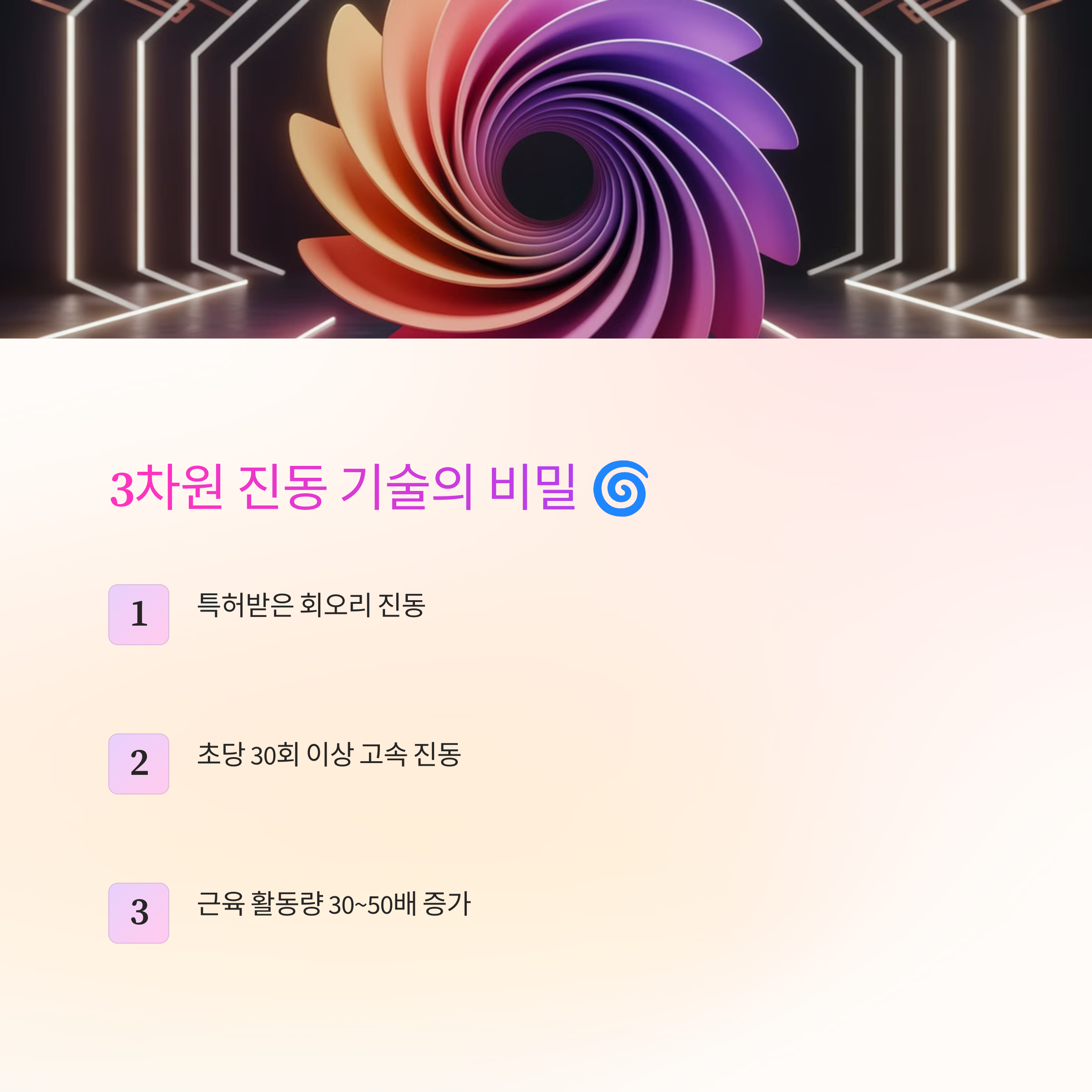 | 나선형 3D 진동파 | 근육 깊숙이 자극하여 마사지 효과 증대 |