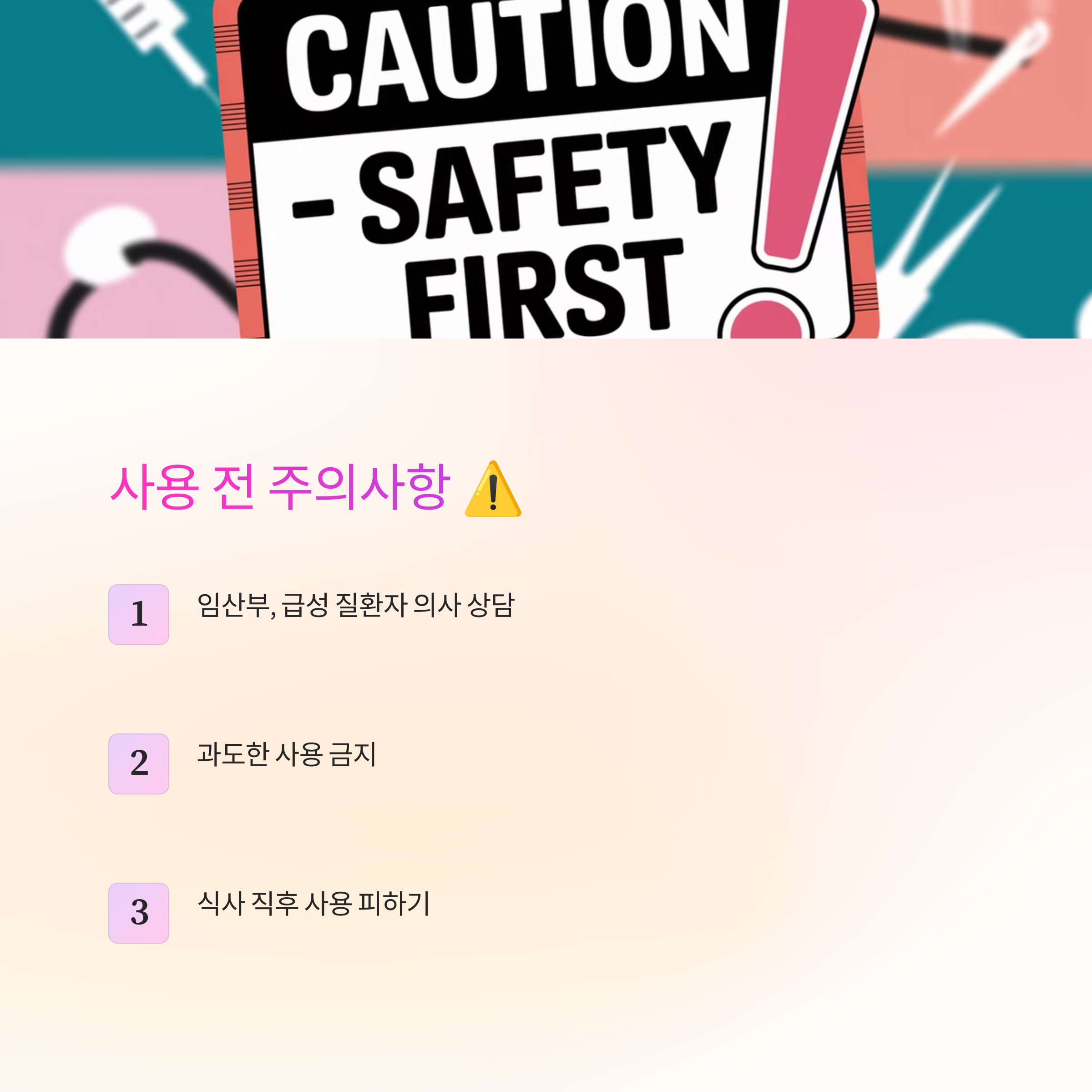 - 💧 수분 섭취: 사용 전후 충분한 물 섭취 필수