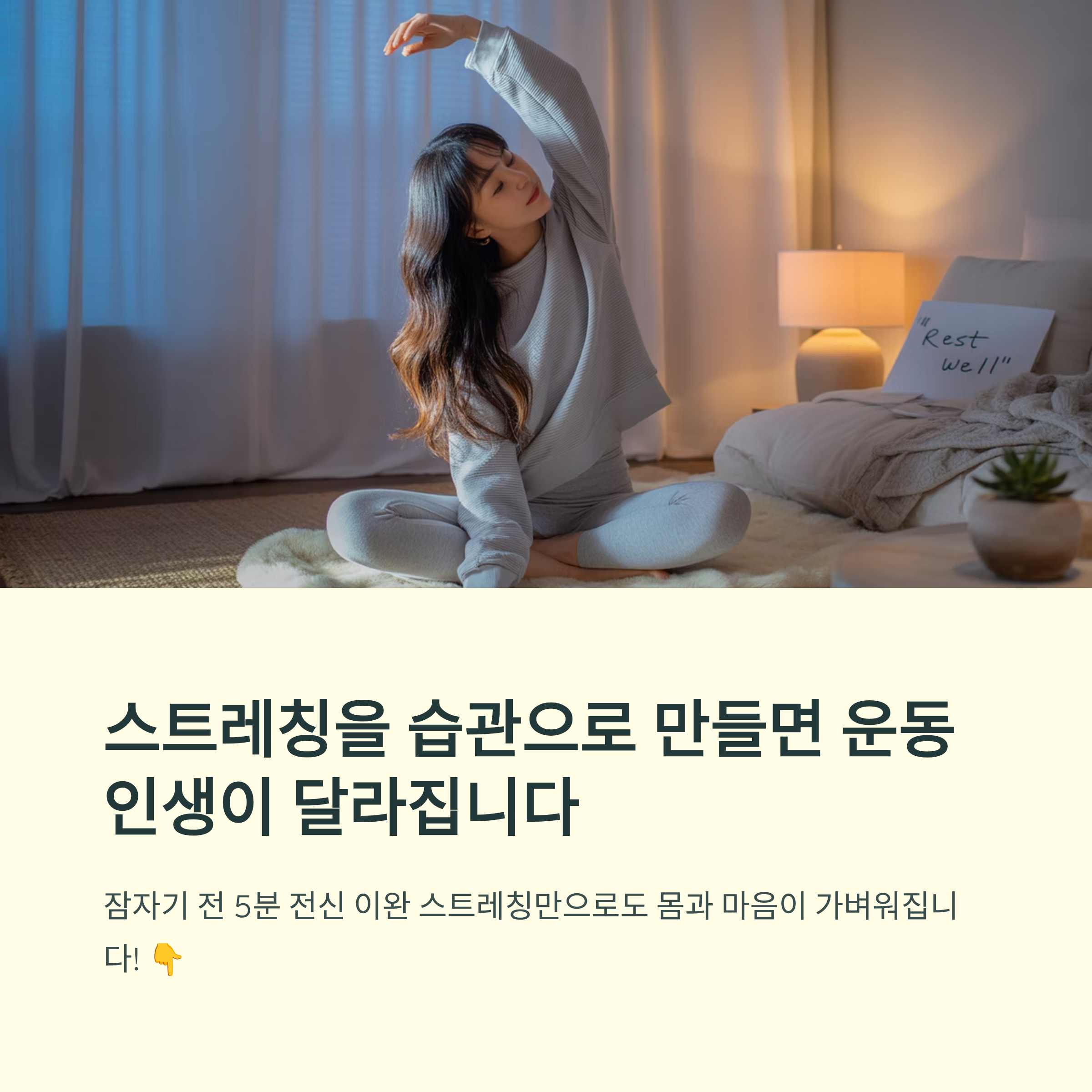잠자기 전 5분의 전신 이완 스트레칭만으로도 몸과 마음이 훨씬 가벼워질 수 있습니다.