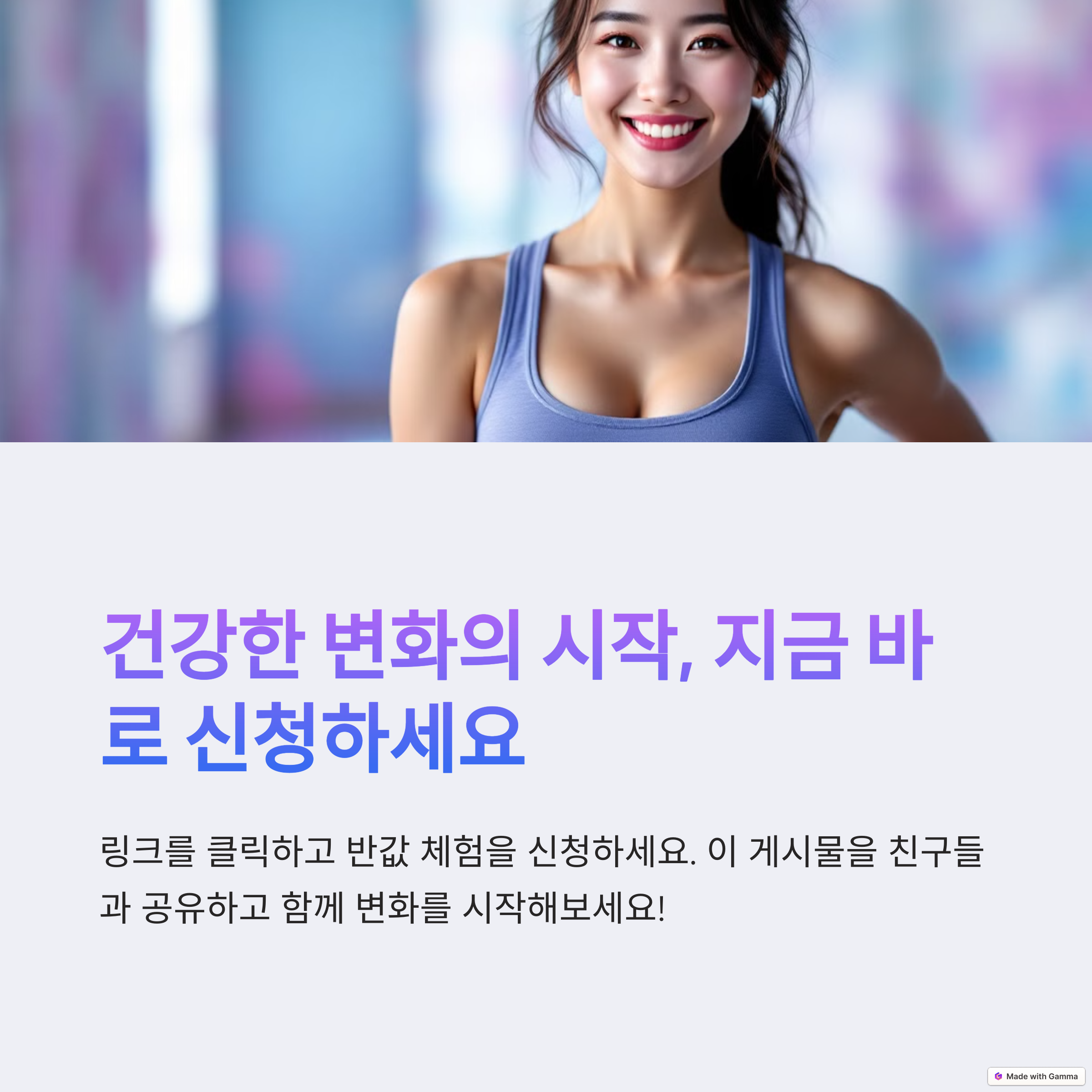 지금 신청하시면 1회 체험권을 반값에 이용할 수 있습니다. 단기간에 효율적인 다이어트와 근력 강화를 원하신다면, 이 기회를 놓치지 마세요!