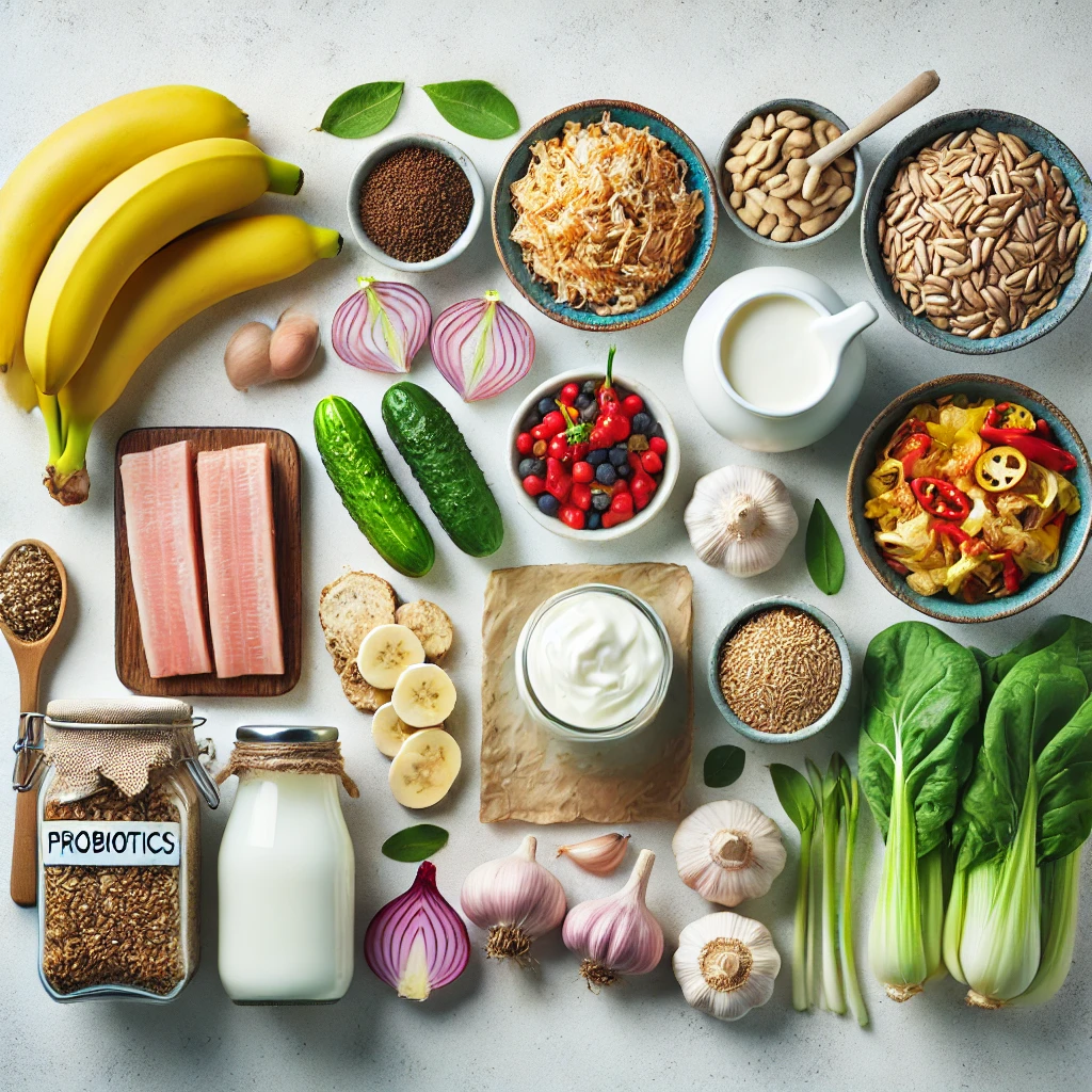 | 장 건강을 위해서는 프로바이오틱스가 풍부한 발효 식품을 섭취하는 것이 좋습니다. 대표적으로 요거트, 김치, 된장, 청국장 등이 있습니다. 또한 프리바이오틱스(유산균의 먹이)가 포함된 바나나, 마늘, 양파 등의 식품도 함께 섭취하면 더욱 효과적입니다. |