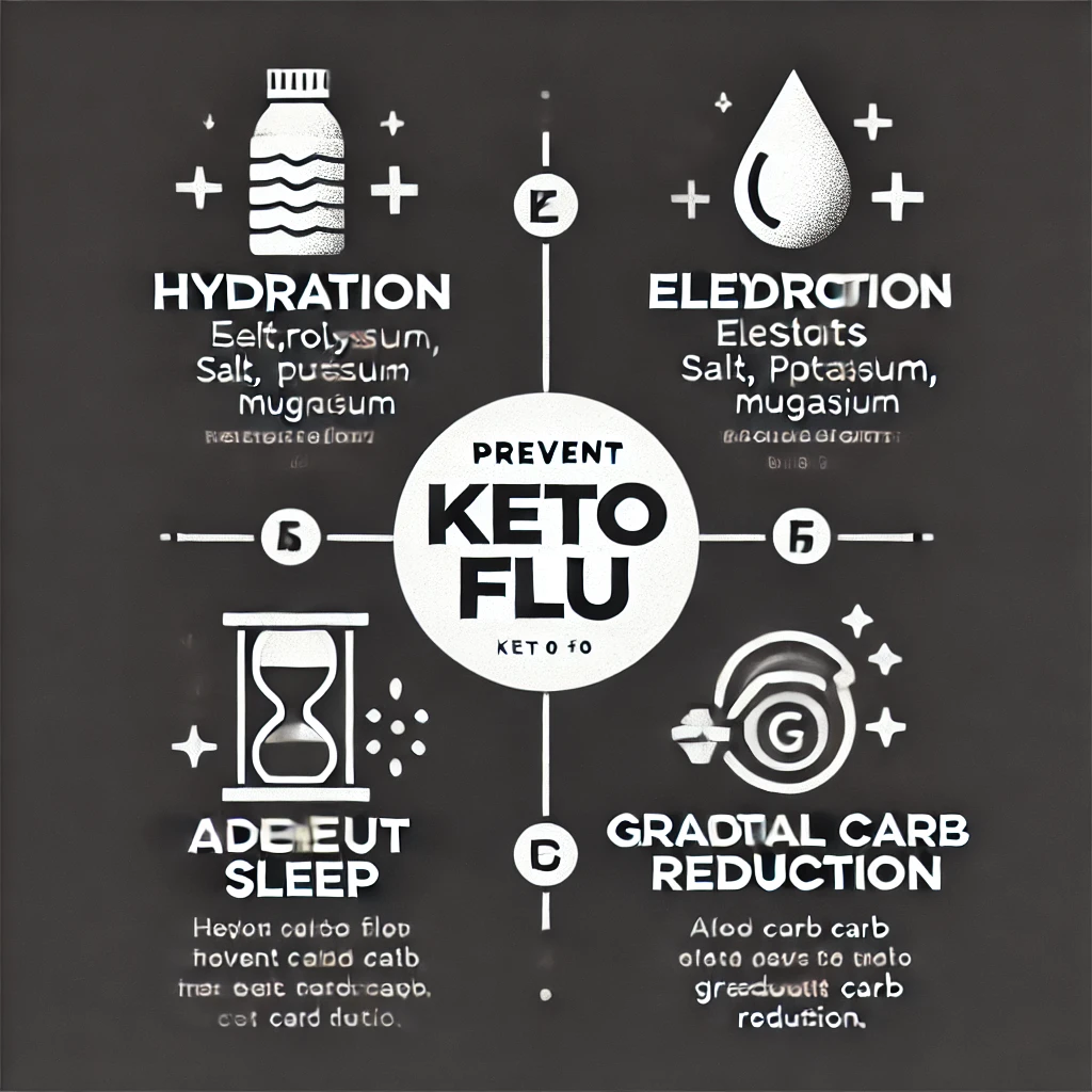 | 키토 플루는 초기 적응기에 나타나는 현상으로, 탄수화물 섭취 감소로 인해 발생합니다. 예방하려면 수분과 전해질(소금, 마그네슘, 칼륨) 섭취를 충분히 하고, 적응 기간 동안 무리한 운동을 피하는 것이 중요합니다. |