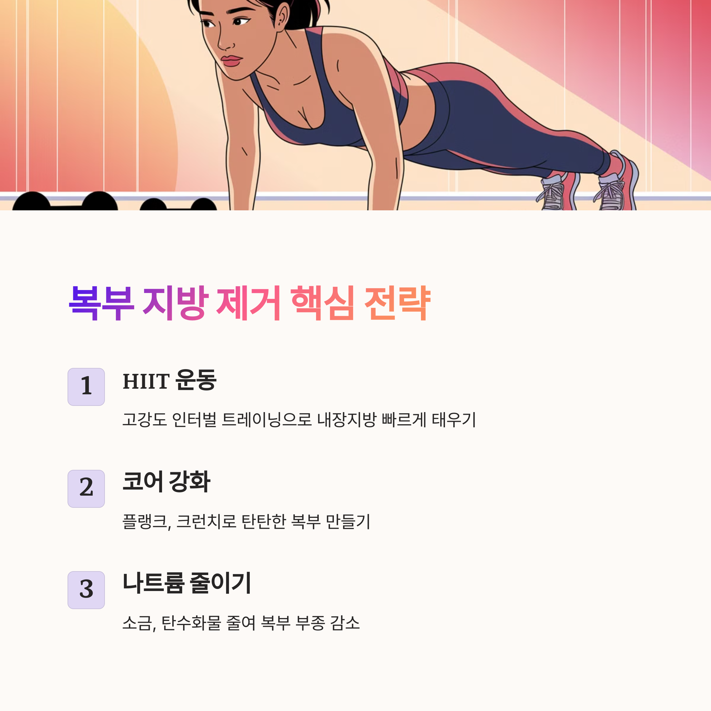 | HIIT 운동 | 고강도 인터벌 트레이닝으로 복부 지방을 빠르게 태울 수 있어요! |