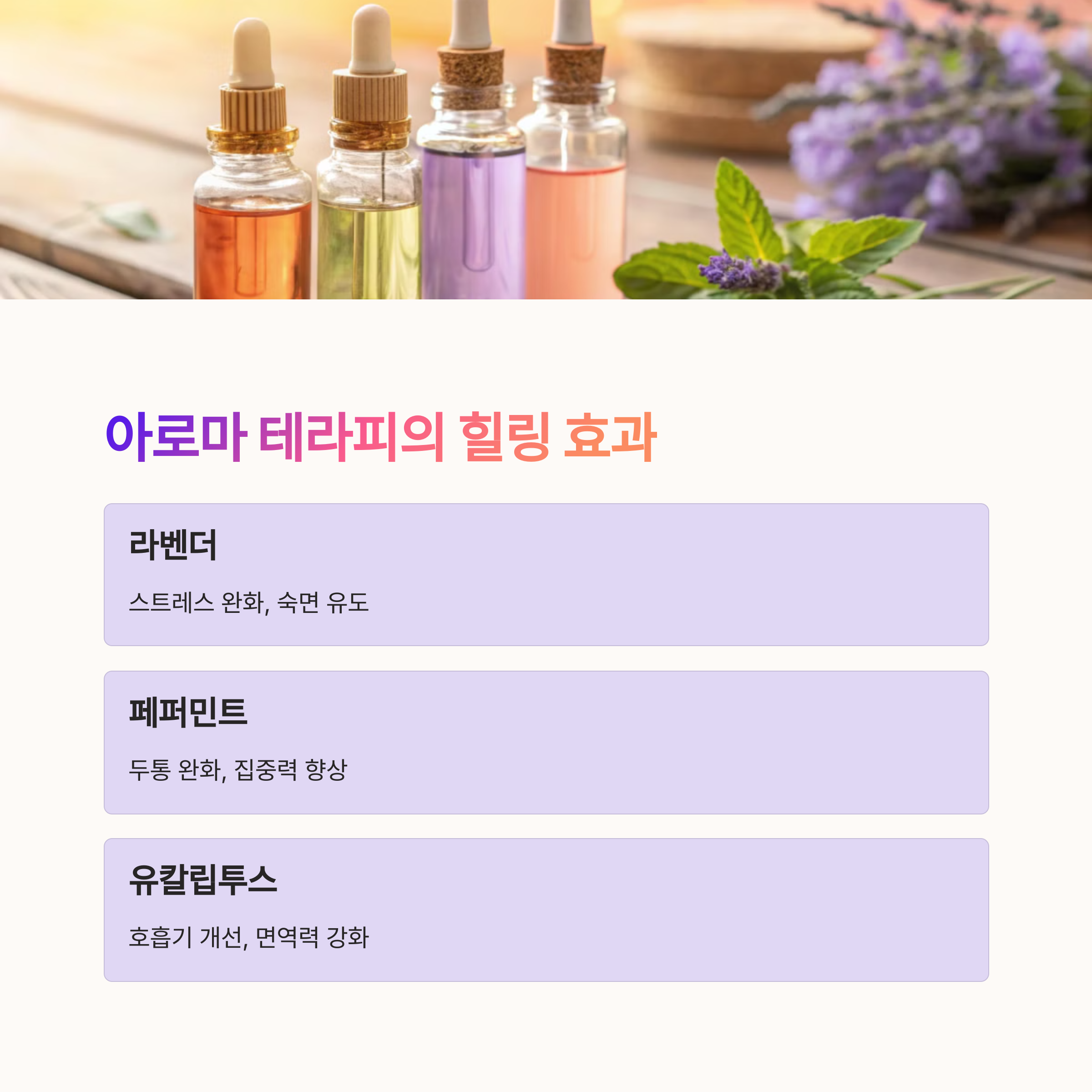 아로마 테라피는 향기를 통해 신체와 정신을 안정시키는 자연적인 힐링 방법입니다. 천연 오일에서 추출한 아로마 향이 신경을 진정시키고, 혈액순환을 촉진하여 피로 회복에 도움을 줍니다. 아래는 대표적인 아로마 오일과 그 효능입니다.