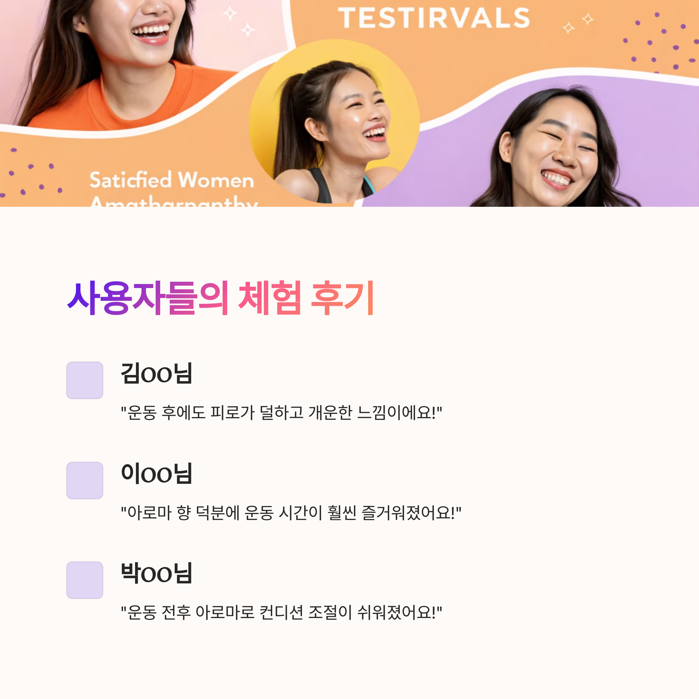 - "아로마 향 덕분에 운동 시간이 훨씬 즐거워졌어요!" - 이OO님