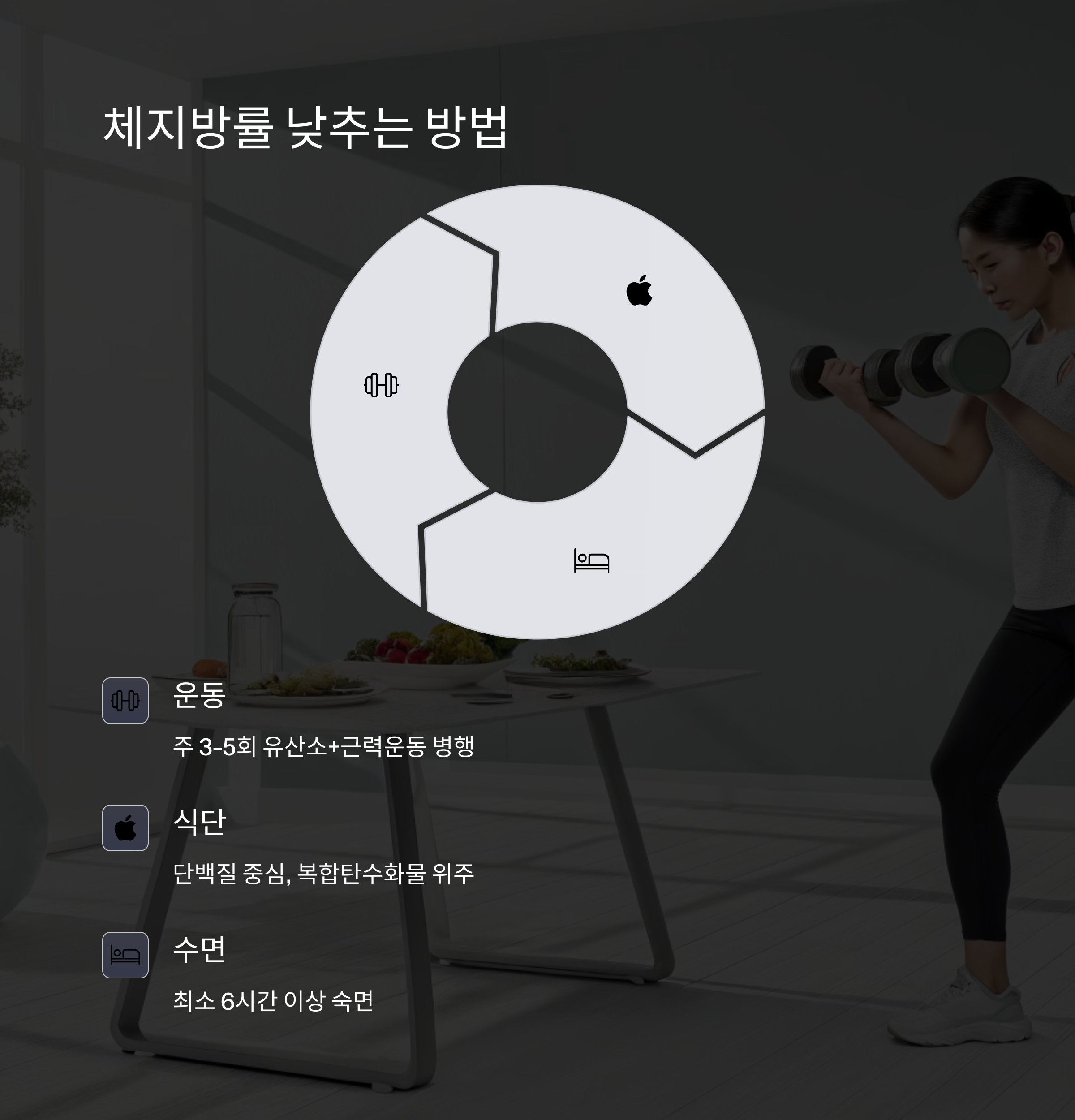 체지방률을 효과적으로 낮추기 위해선 단순히 굶거나 유산소 운동만 하는 방식으로는 부족합니다. 근육량을 유지하면서 지방을 줄이는 전략이 필요해요. 아래는 실생활에서 적용할 수 있는 방법을 요약한 표입니다.