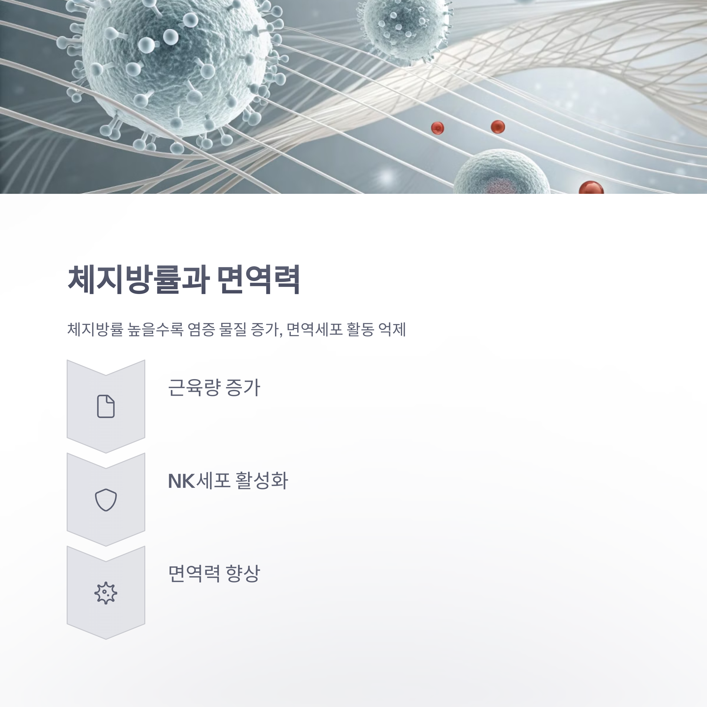 최근에는 체지방률과 면역력 사이의 상관관계가 다양한 연구를 통해 밝혀지고 있습니다. 체지방률이 높아질수록 염증 물질이 증가하고 면역세포의 활동이 억제된다는 보고가 많죠. 특히 NK세포(Natural Killer Cell)의 활성도는 근육량과 연관이 크다고 알려져 있어요. 즉, 근육량이 많고 체지방률이 낮을수록 면역 기능이 활발하다는 이야기입니다.