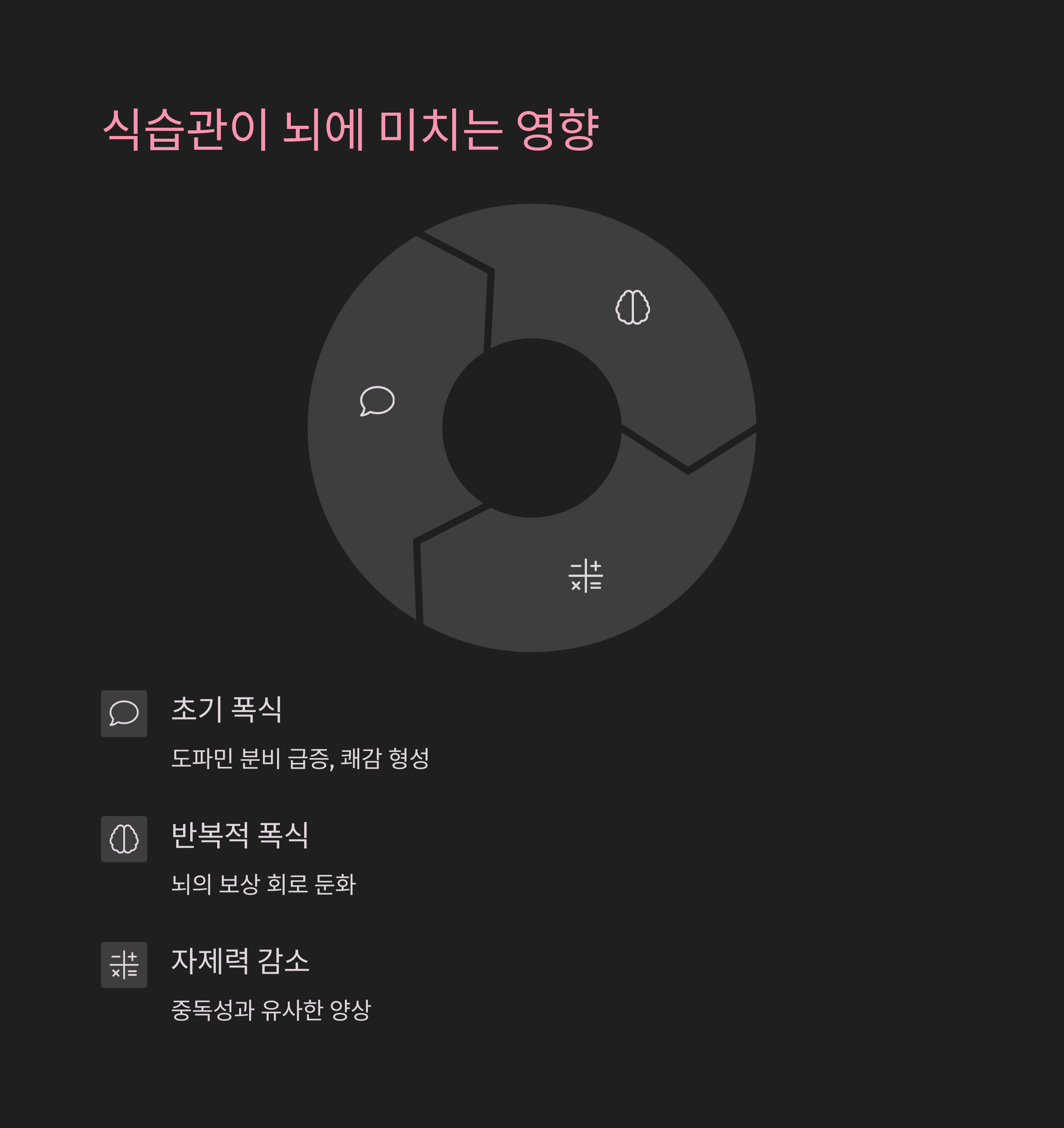 | 반복적 폭식 | 뇌의 보상 회로 둔화 | 더 많은 자극 요구 |