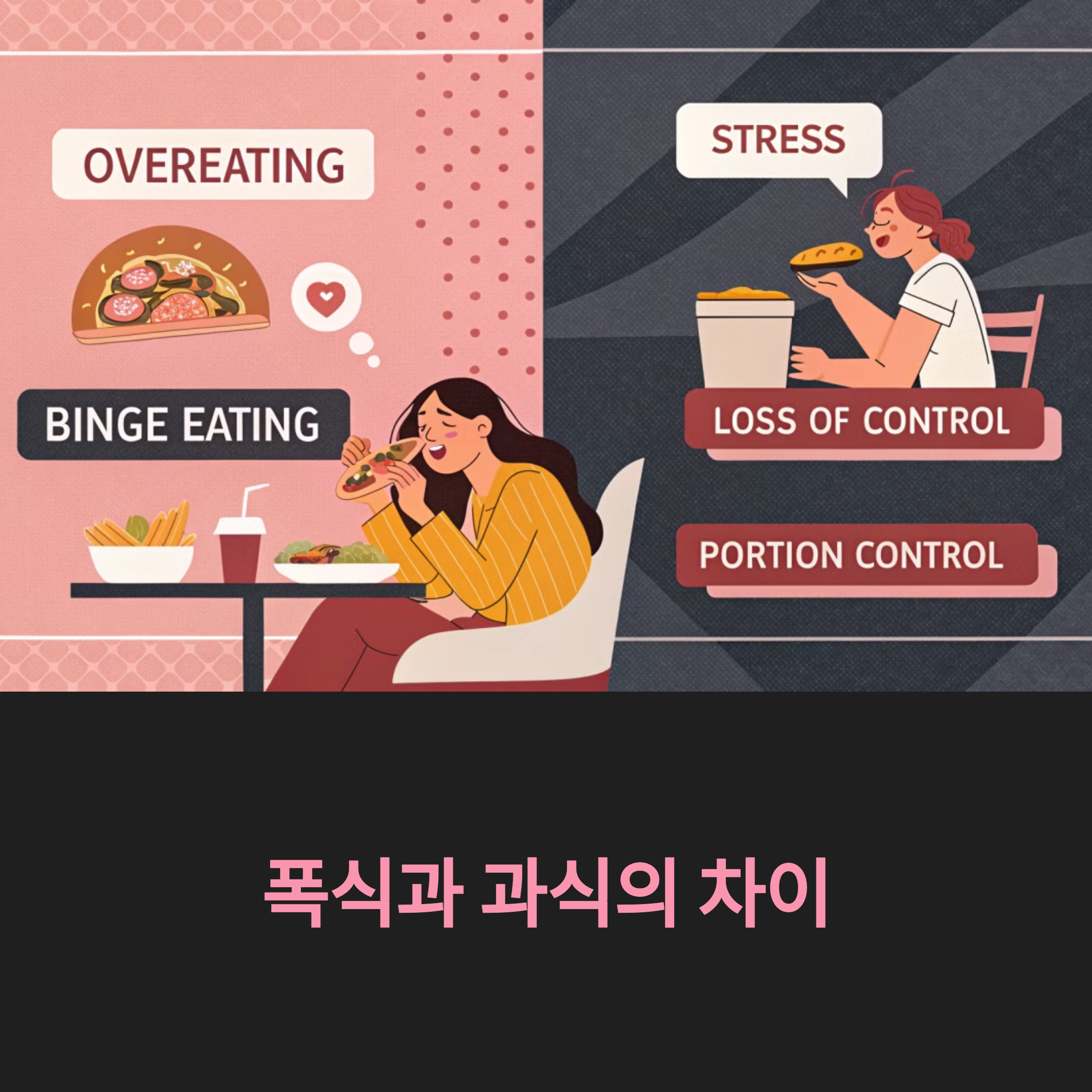 우리가 흔히 헷갈리는 개념 중 하나가 ‘폭식’과 ‘과식’의 차이입니다. 두 용어는 비슷해 보이지만 실제로는 다음과 같은 차이가 있습니다.