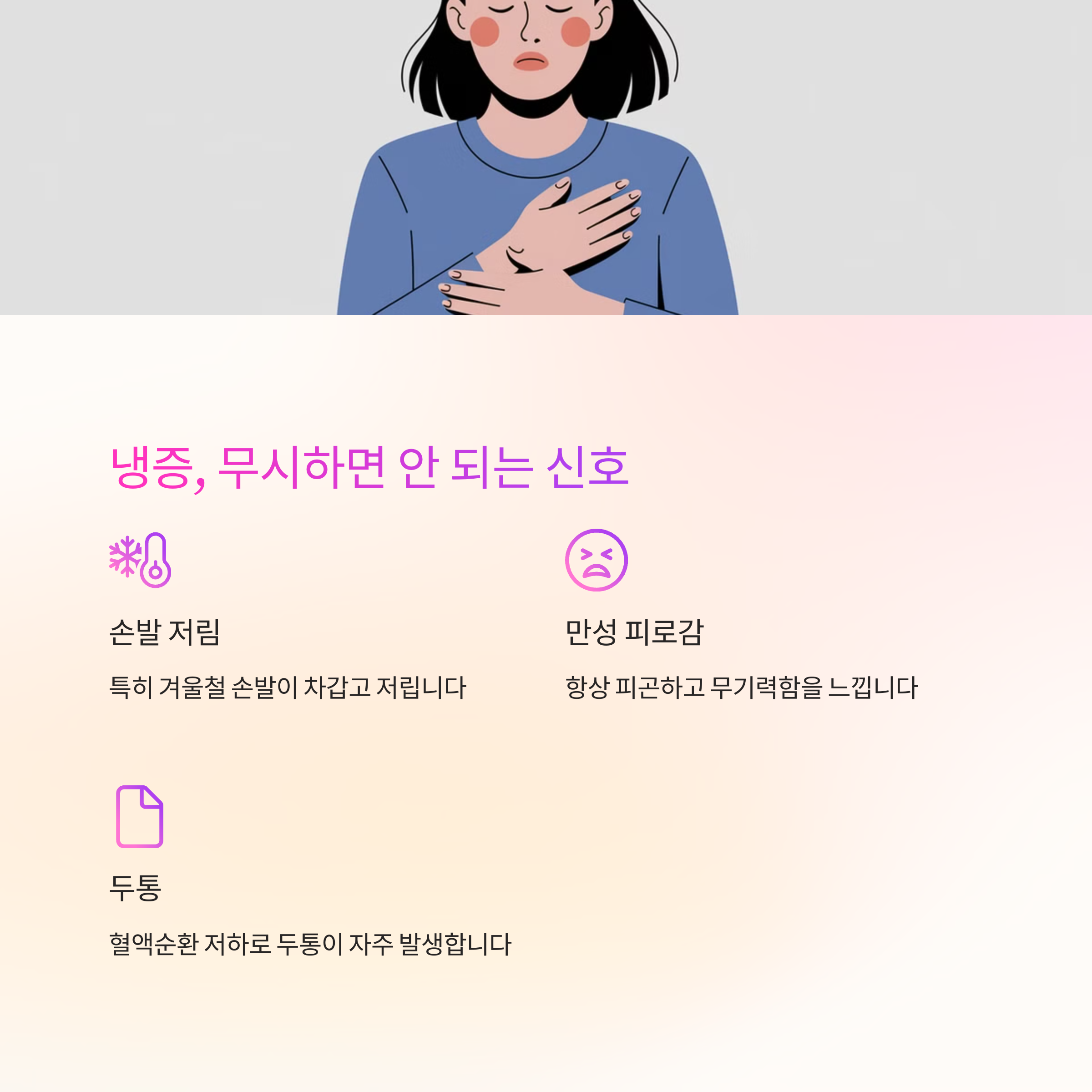 냉증(冷症)은 혈액순환이 원활하지 않을 때 발생하는 대표적인 증상입니다. 손발이 차갑거나 몸이 쉽게 피로해지는 분들은 혈액순환 장애로 인해 체온이 낮아졌을 가능성이 높아요. 냉증은 단순히 불편함을 초래하는 것이 아니라, 장기적으로 건강에도 영향을 미칠 수 있습니다. 아래 표를 통해 냉증이 우리 몸에 미치는 영향을 살펴볼까요?
