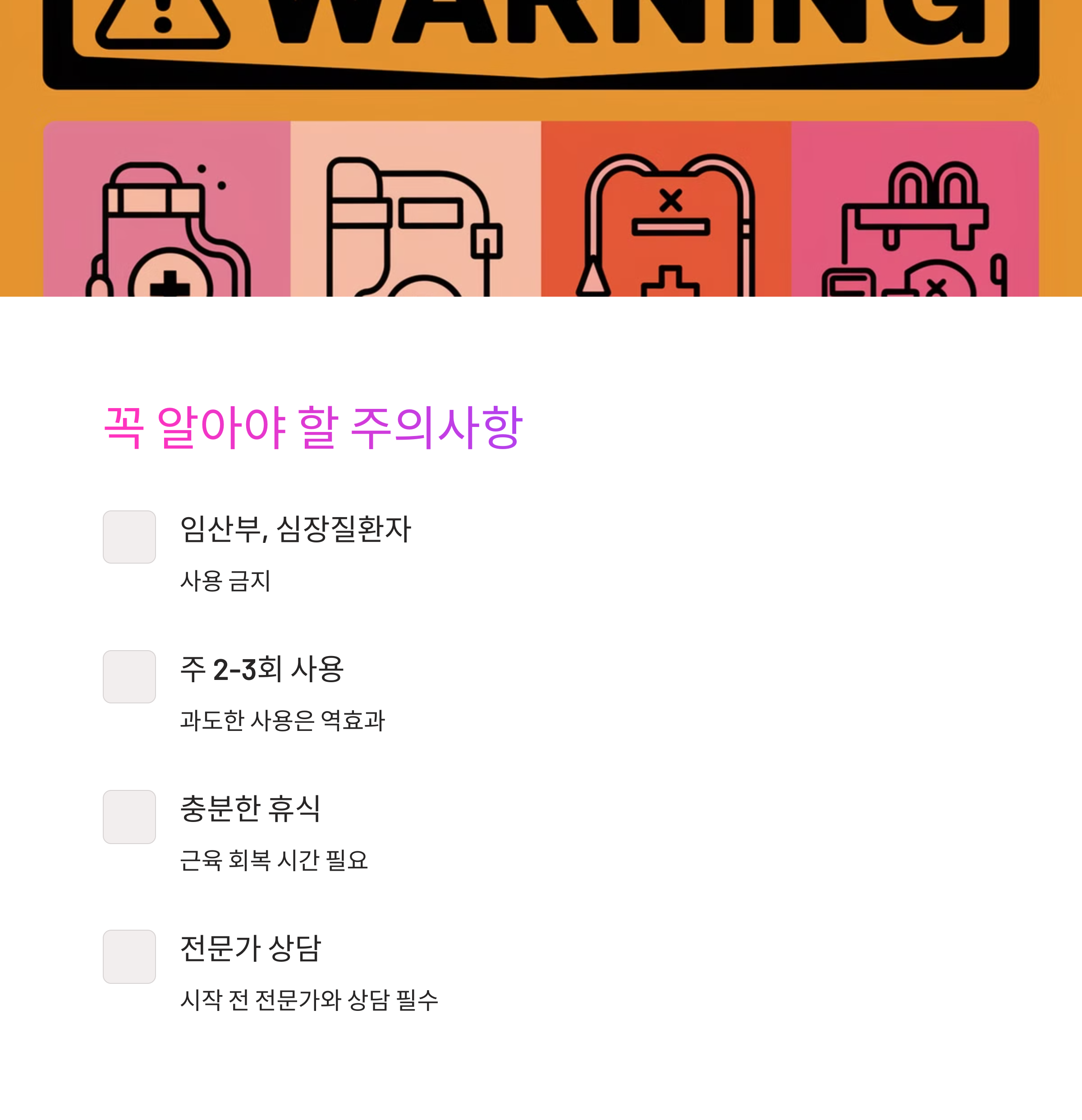 EMS 트레이닝은 효과적이지만, 올바르게 사용하지 않으면 부작용이 발생할 수도 있습니다. 안전하고 효과적인 EMS 활용을 위해 다음의 주의사항을 기억하세요.
