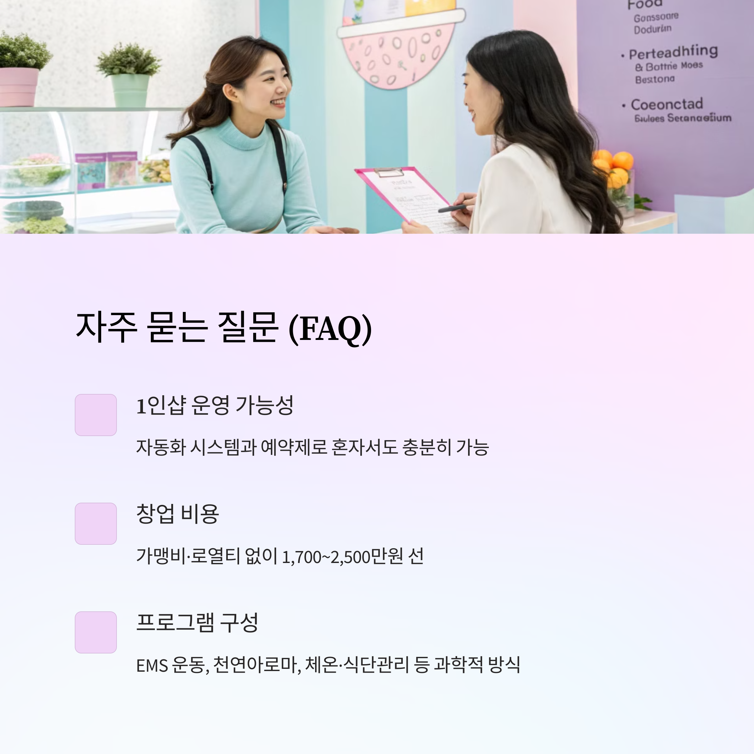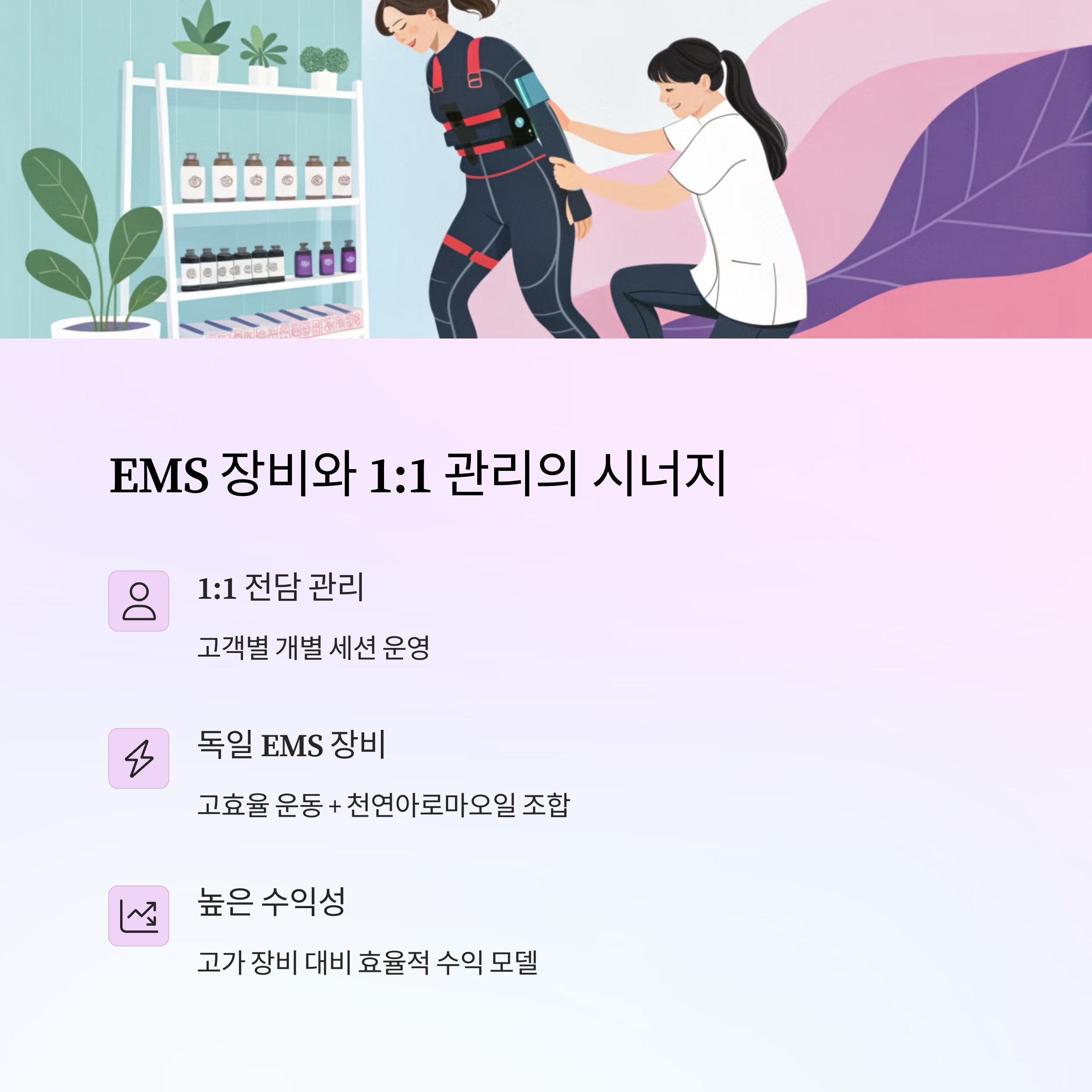 독일 오리지널 EMS 장비와 천연아로마 오일은 고객들의 신뢰를 얻는 가장 강력한 무기예요. 게다가 1:1 전담 관리 시스템까지 더해지면, 단순한 다이어트가 아니라 맞춤형 프리미엄 다이어트 서비스로 자리잡을 수 있어요.