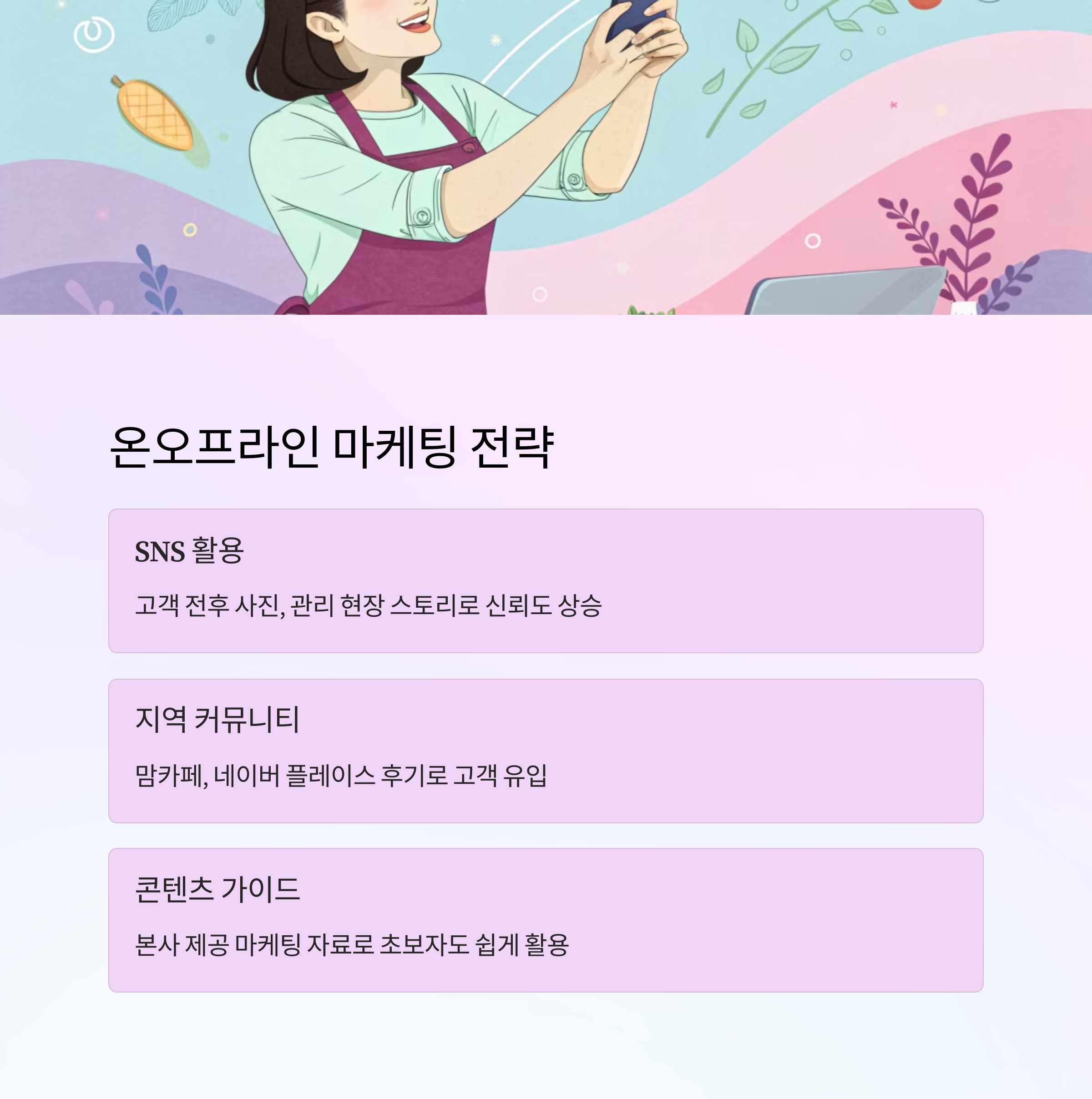 1인샵의 생명력은 마케팅에서 나옵니다. 단골 고객이 많은 샵일수록, 대부분 오프라인 입소문과 SNS 채널을 잘 활용한 결과예요. 예를 들어, 인스타그램에 고객 전후 사진, 관리 현장 스토리, 실시간 소통을 올리면 신뢰도가 폭발적으로 올라갑니다.