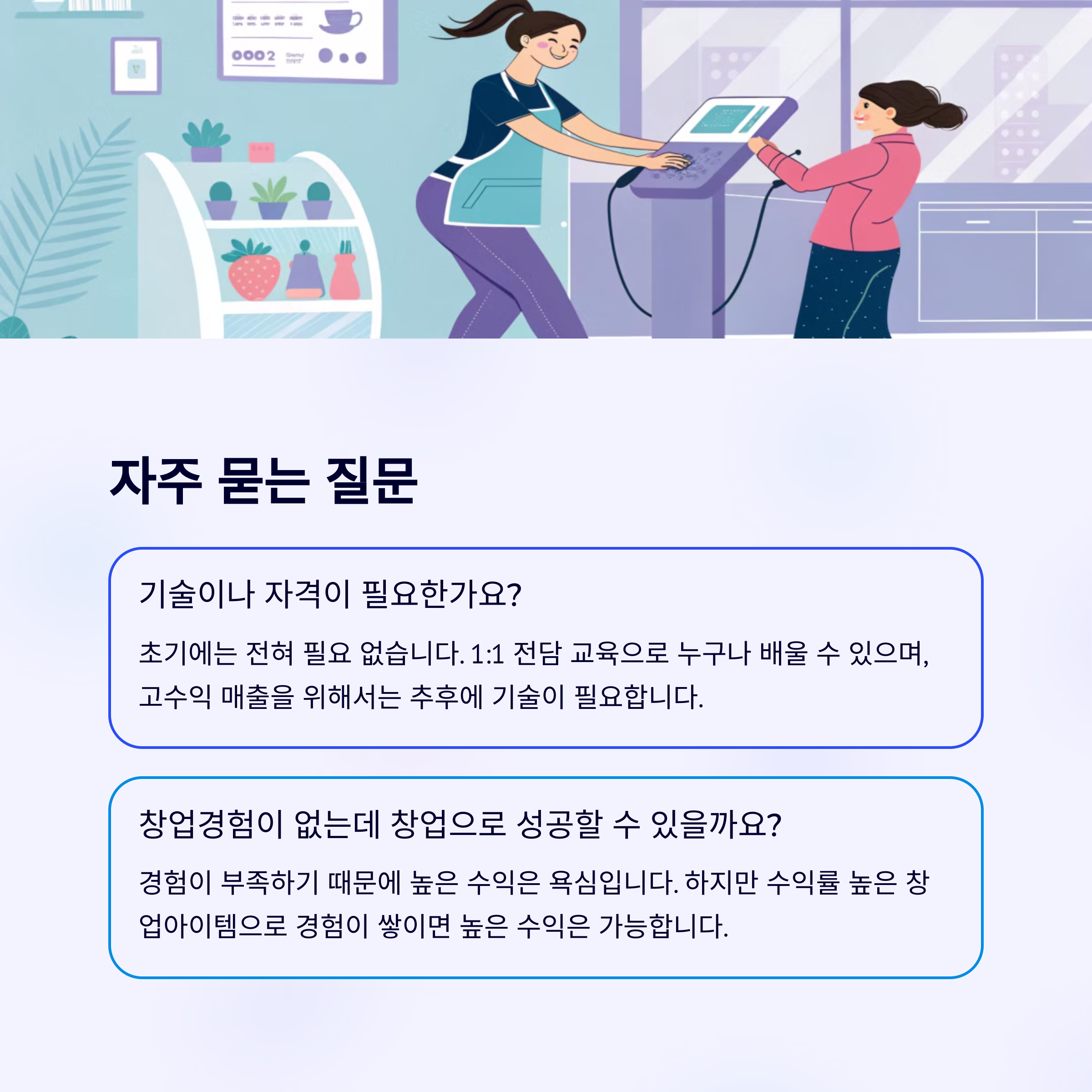 1인 창업이 가능한 시스템도 눈에 띕니다. 복잡한 기술이나 별도의 자격 없이도 본사 교육만으로 충분히 운영할 수 있도록 구성되어 있으며, 고객 맞춤형 프로그램은 자동화된 시스템을 통해 제공되기 때문에, 많은 인력 없이도 안정적인 운영이 가능합니다.