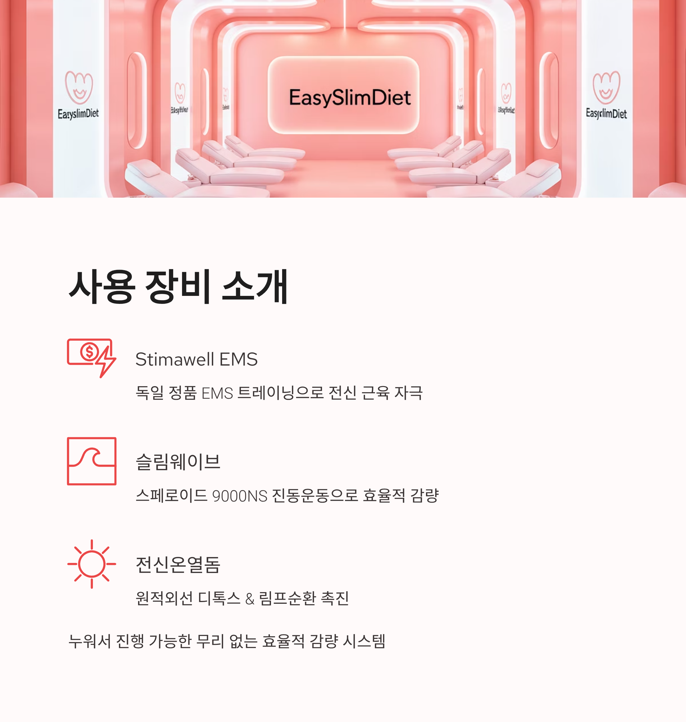 이지슬림 도담점은 최첨단 프리미엄 장비 3종을 모두 한 달간 집중 사용합니다.  ✔ Stimawell EMS (독일 정품 EMS 트레이닝)   ✔ 슬림웨이브 (스페로이드 9000NS 진동운동)   ✔ 전신온열돔 (원적외선 디톡스 & 림프순환) 등.  이 장비들은 누워서 진행할 수 있어 무리 없이 효율적인 감량을 도와드립니다.
