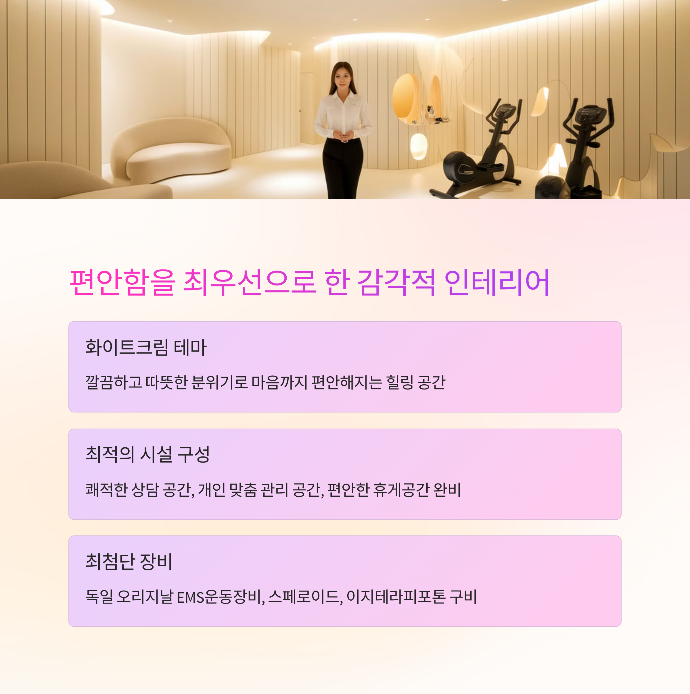 | 주요 장비 | 독일 오리지날 EMS운동장비, 스페로이드, 이지테라피포톤 |