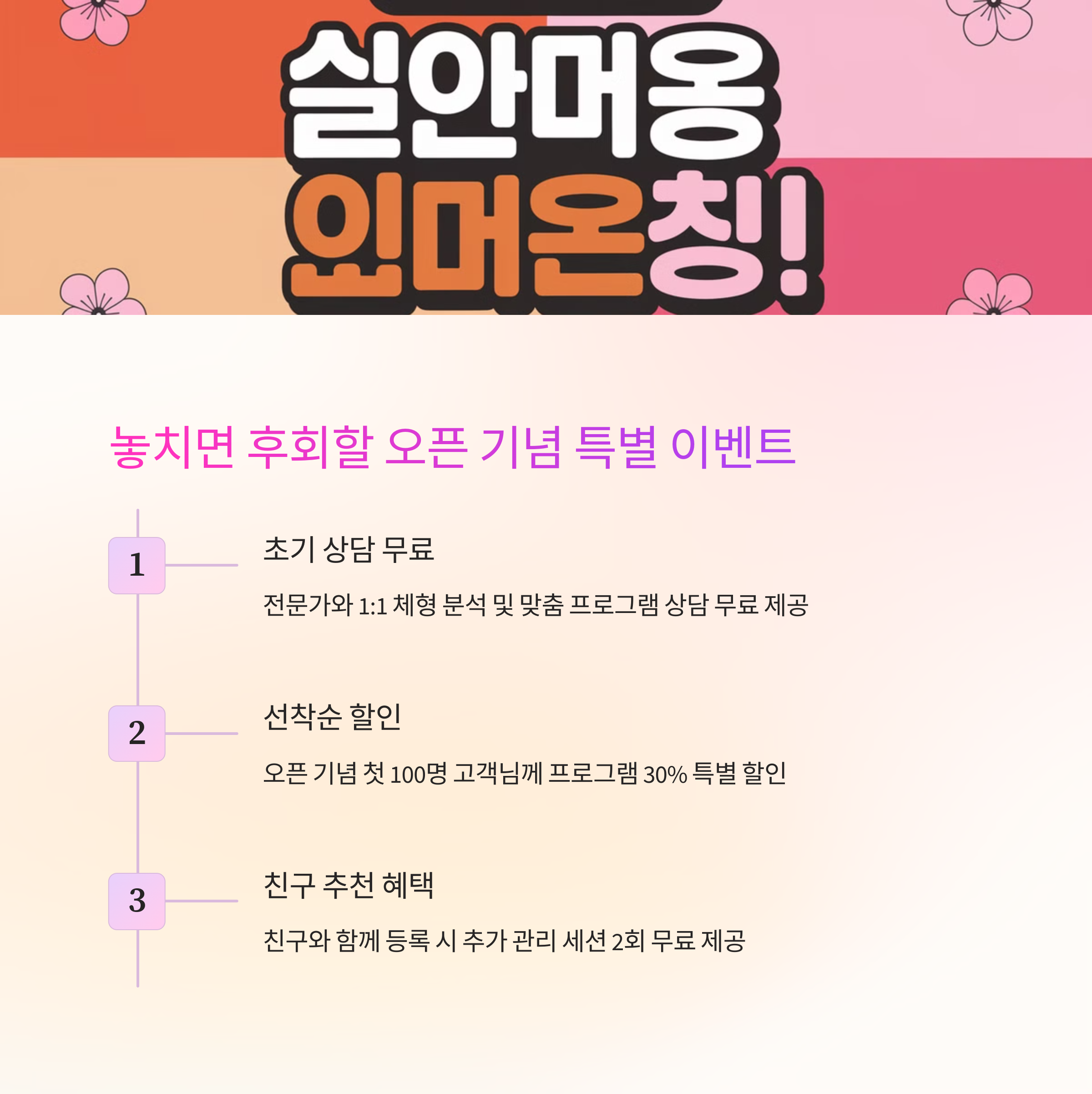 목동점 오픈을 기념하여 한시적인 특별 혜택을 준비했어요! 신규 고객님들을 위한 특별한 기회 놓치지 마세요.