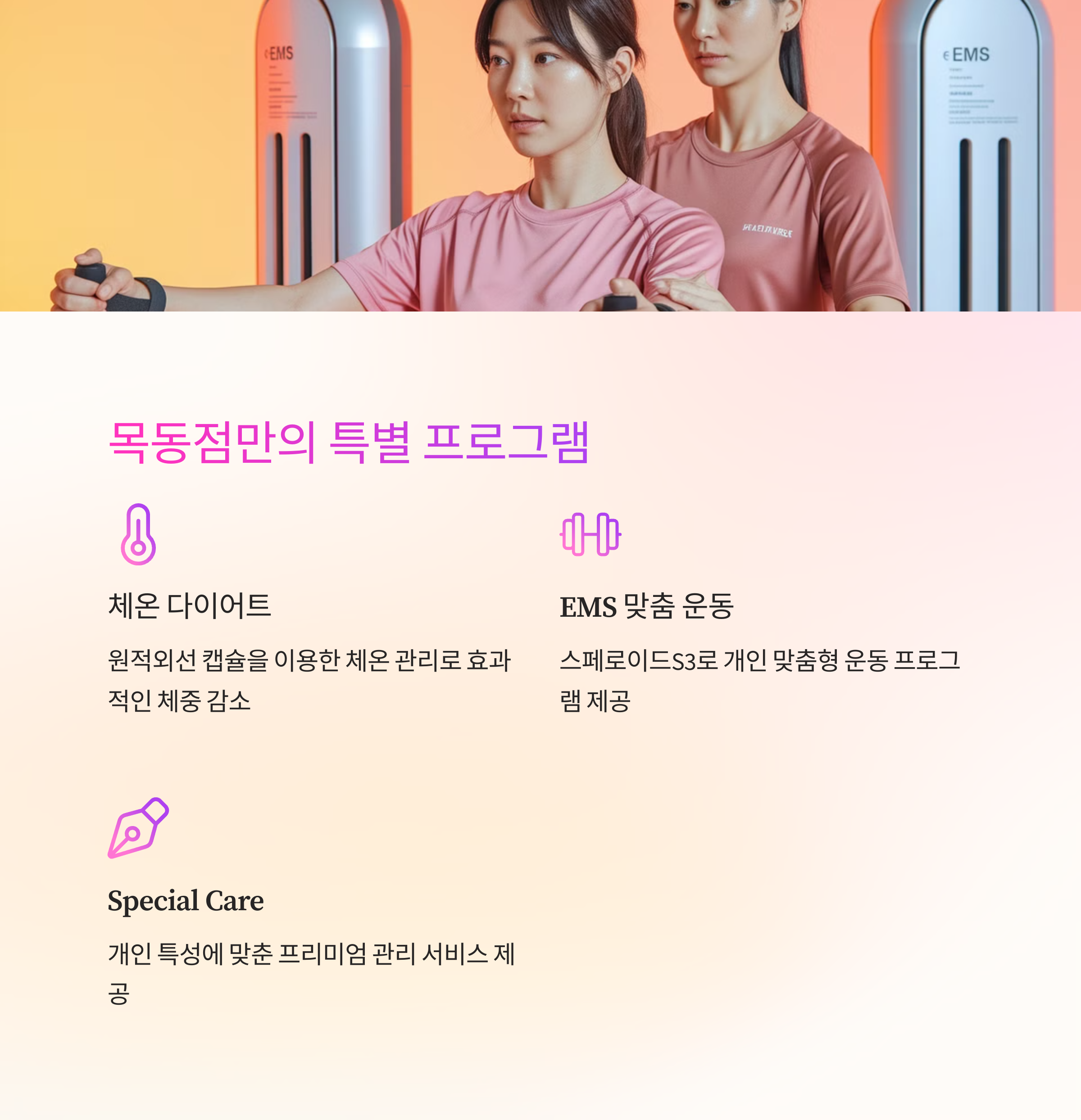 | 최신 관리 장비 | EMS운동장비, 스페로이드, 이지테라피포톤 등 최신 운동 및 관리 장비 |