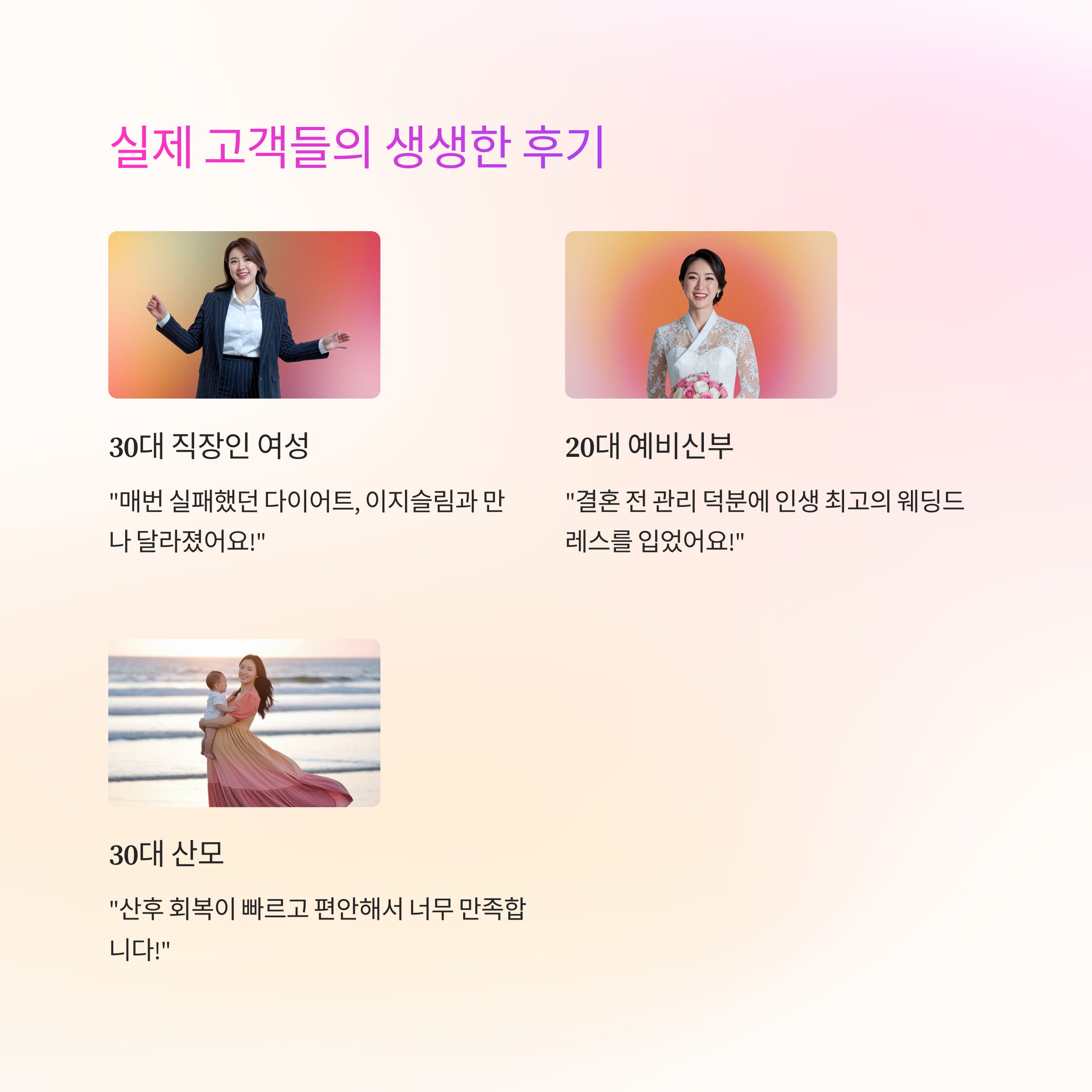 - "결혼 전 관리 덕분에 인생 최고의 웨딩드레스를 입었어요!" - 20대 예비신부